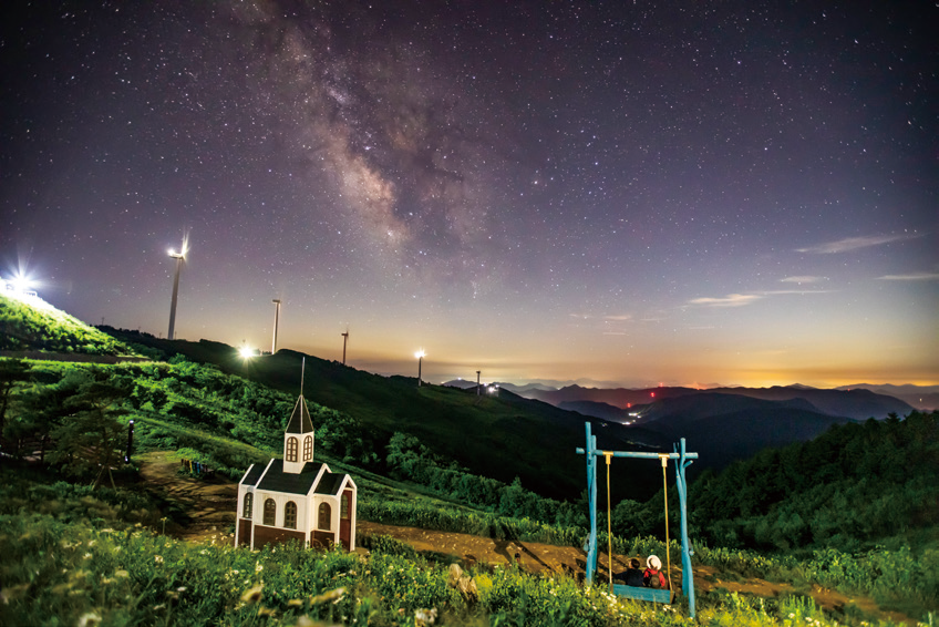 강원도 정선군과 평창군에 걸쳐 있는 해발 1,256m 청옥산 정상 부근에 ‘육백마지기’ 라는 너른 평원이 있다. 축구장 여섯 개를 합쳐 놓은 것과 맞먹는 규모의 육백마지기는 탁 트인 전망 덕분에 밤하늘을 올려다보기에 더없이 좋은 장소다. 특히 샤스타데이지가 만개하는 시기(6~9월)에 방문하면 별빛에 반사된 흰 꽃들이 땅 위의 은하수처럼 출렁인다. 다만, 은하수 명당이라고 해서 언제나 그 장관을 볼 수 있는 건 아니다. 달이 밝은 날에는 오히려 별이 보이지 않는다. 어둠이 깊을수록 별은 더욱 선명해지기에 달빛이 없는 그믐밤에 방문하는 것이 좋다.