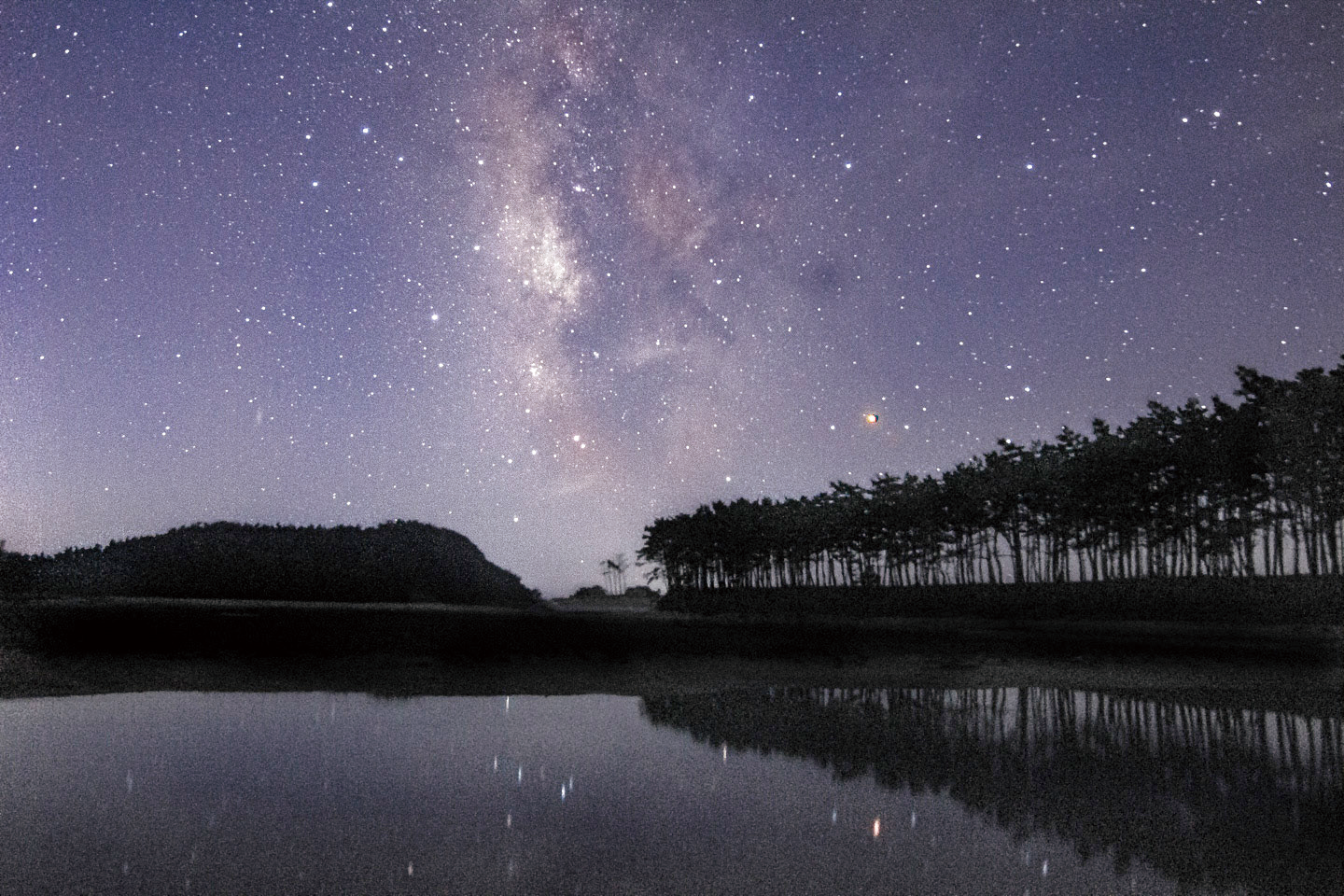 해가 수평선 너머로 모습을 감추려는 시간, 태안 운여해변은 온통 붉게 물든다. 떨어지는 낙조를 하염없이 바라보다 해가 완전히 넘어간 후에는 또 다른 낭만을 자아낸다. 아득한 밤하늘에 하나씩 모습을 드러내는 별이 이내 하늘을 꽉 채우며 특별한 아름다움을 만들기 때문. 운여해변의 은하수 감상 포인트로 가기 위해서는 캠핑장 입구 길목에서 해변으로 좀 더 걸어 들어가면 된다. 이곳에는 소나무가 빼곡한 제방이 있는데, 밀물 때면 바닷물이 솔숲 안쪽까지 밀려 들어오면서 마치 호수처럼 반영을 만든다. 섬처럼 떠오른 솔숲과 하늘을 뒤덮은 찬란한 은하수가 데칼코마니처럼 비추어 온 세상을 별천지로 만든다.