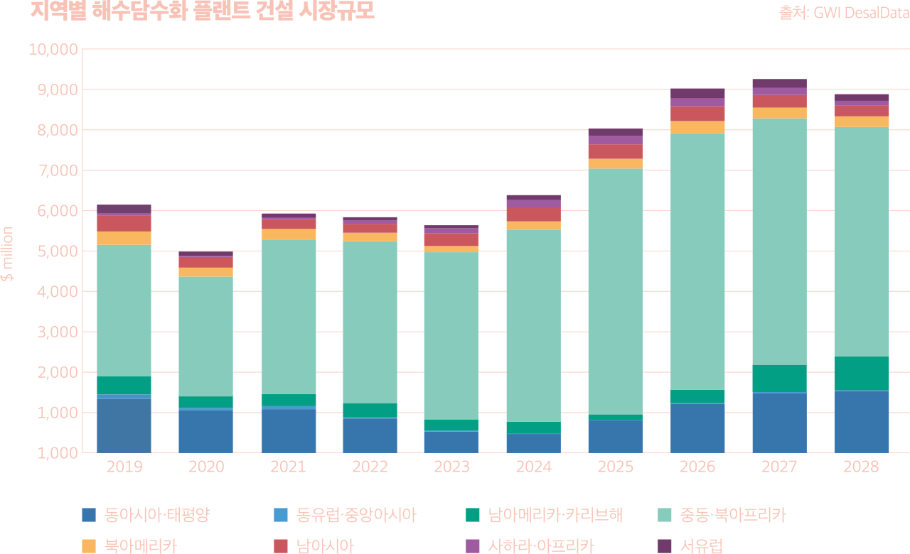 전 세계적으로 인구 증가와 산업화가 가속화되면서 물 수요가 꾸준히 증가하고 있다. 특히 반도체와 인공지능(AI) 등 첨단산업의 성장으로 물 사용량은 기하급수적으로 늘어나는 추세다. 여기에 기후변화로 가뭄이 더 빈번하고 심각하게 발생하면서, 기존의 댐과 하천 중심의 용수공급 체계로는 안정적인 물 공급을 담보하기 어려운 상황이다. 이에 따라 전 세계적으로 물 부족 문제를 해결하기 위해 대체수자원에 대한 관심이 높아지고 있다. 특히 지리적으로 물이 부족한 중동과 북아프리카 국가를 중심으로 해수담수화 시장이 빠르게 성장하고 있다.
