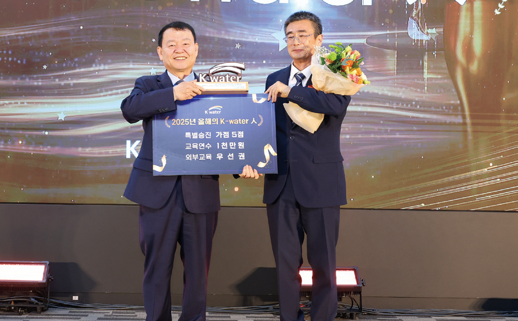 이어 ‘올해의 K-water人’이 발표됐다. ‘올해의 K-water人’은 조직기여도가 높고 한 해 동안 탁월한 성과를 창출해 모범이 되는 우수직원에게 수여되는 상이다. 올해 수상자는 글로벌사업처 박장원 부장으로, 필리핀 앙갓댐 수력발전 사업을 시작해 사업 기반을 다지기까지 기여한 성과가 높이 평가되었다. 이밖에도 노사공동 e스포츠 경연대회가 열려 직원들의 참여와 화합을 더했다. 이번 기념식은 새로운 비전 선포뿐 아니라 직원들간의 소통과 협력의 가치 또한 되새기는 자리였다. 한국수자원공사는 이번 기념식을 계기로 AI 기반 물관리로 반도체 등 국가 전략산업을 지원하고, 2030년까지 AI 물관리 분야 세계 1위 기업으로 도약해 대한민국이 AI 3대 강국으로 나아가는데 기여해나갈 예정이다.