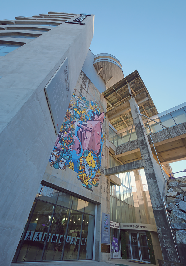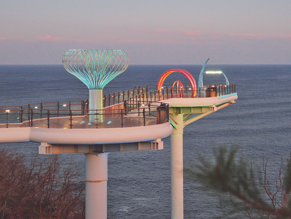 The Mukho Lighthouse area has been developed into a Marine Culture Park and connects to Dojjaebi-gol Sky Valley. “Dojjaebi” is a local dialect for “dokkaebi” (goblin). On pitch-dark nights when rain fell, a bluish light would appear, resembling a goblin fire, which is how the area came to be called Dojjaebi-gol. Long ago, the thought of walking through this valley late at night would have sent chills down one’s spine, but today Dojjaebi-gol Sky Valley stands here. Its main facilities include the Skywalk observation deck and experiential attractions such as the Sky Cycle and the Giant Slide. In winter, however, the harsh weather can make these experiences challenging. Below Dojjaebi-gol is Haerang Observatory, which offers panoramic views of the sea. Stepping onto it, visitors are confronted with waves crashing violently beneath the transparent glass floor. Both facilities illuminate the night with colorful LED lights, creating a fantastical nightscape, and their popularity has earned them a place among the “Top 100 K-Culture Tourism Events.”