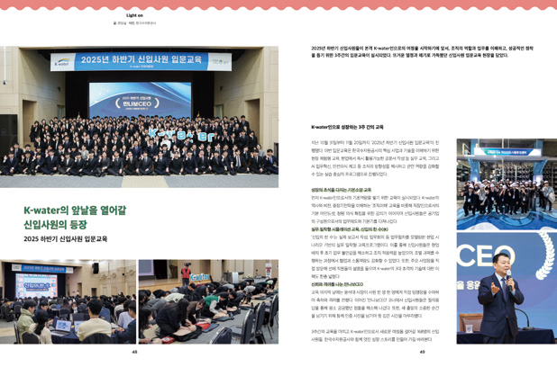- K-water의 새로운 인재들이 조직의 역할과 업무를 이해하며 성공적으로 정착하기 위해 열심히 배우고 있는 모습이 정말 인상적이었습니다. 이들이 펼쳐갈 한국수자원공사의 역동적인 내일이 더욱 기대됩니다. 파이팅!
