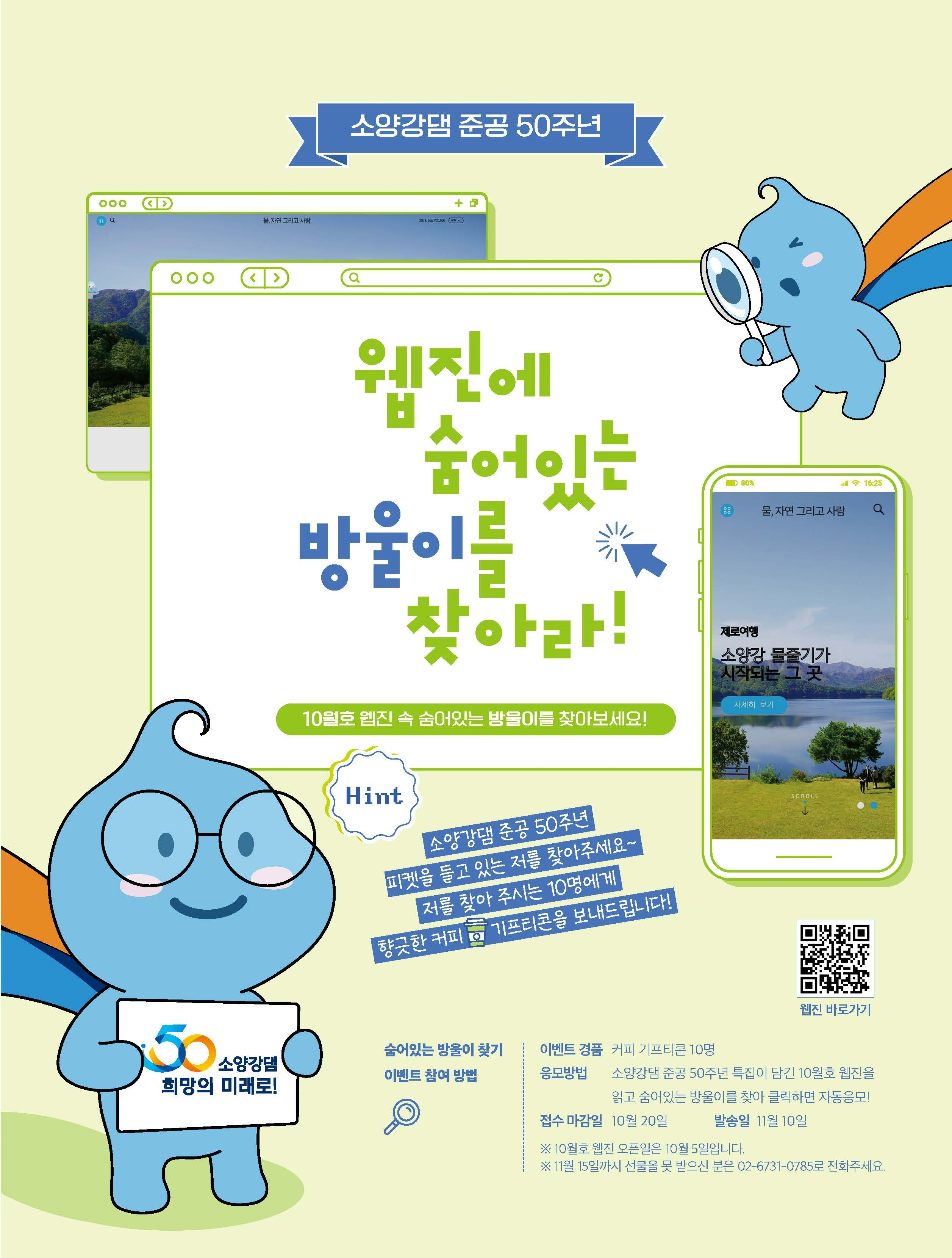 - 응모방법 소양강댐 준공 50주년 특집이 담긴 10월호 웹진을 읽고 숨어있는 방울이를 찾아 클릭하면 자동응모!