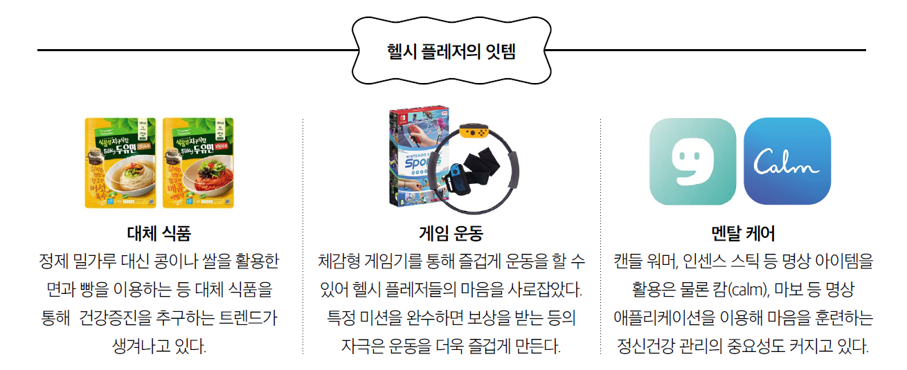 최근 즐거운 건강관리법에 대한 관심이 커지고 있다. 이러한 움직임으로 MZ세대 사이에서 ‘헬시 플레저’라는 긍정적인 신조어가 탄생해 주목을 받고 있다. 헬시 플레저란, 높은 강도의 운동과 식단 조절이 아닌 즐거움에 초점을 맞춘 신체·정신 건강관리법을 일컫는 용어로서 ‘건강(health)관리가 즐거워진다(pleasure)’는 의미를 담고 있다. SNS 인증과 경험, 재미를 중요시하는 MZ세대의 등장과 코로나19 이후로 건강관리에 대한 중요성이 커지면서 생겨난 트렌드 중 하나다. 헬스장이 아닌 체감형 게임 형태로 즐길 수 있는 운동을 하거나 곤약 떡볶이, 두부 티라미수 같은 입맛에 맞는 음식을 즐겨 먹는 것이 하나의 방법이다.