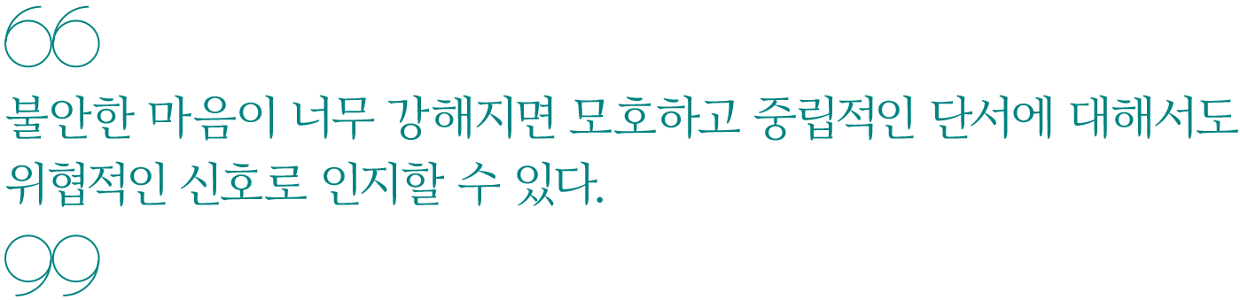 최근 직장생활과 관련하여 방문하는 내담자 중에 “출근만 하면 불안한 상태가 되면서 가슴이 두근거리고, 답답해요.” “회사에서 발표하거나 상사에게 보고할 때 긴장이 되고, 현기증을 느낄 때가 많아요.” 등의 상담 내용을 요청하는 이들이 있다. 어느 정도의 불안은 일상을 지키는 자연스러운 반응이지만, 불안한 마음이 너무 강해지면 모호하고 중립적인 단서에 대해서도 위협적인 신호로 인지할 수 있다. 또한, 지나친 두려움을 느끼게 되면 교감신경이 흥분되어 두통, 심장박동수 증가, 과호흡, 불면과 같은 신체 증상이 동반되기도 한다.