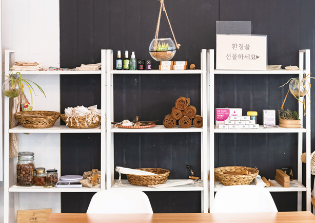권은선<숲을> 대표는 “제로웨이스트 활동에서 가장 중요한 건 ‘할 수 있는 것부터 조금씩 함께 하는 것”이라며 “그 실천 중 하나가 지구환경에 유해한 일회용품이나 플라스틱의 대체재를 찾아쓰는 일”이라고 말했다. “상점 안에 ‘대신’이라는 단어가 흔하게 쓰인 건 이 때문일 것”이라며 “잘 찾아보면 되살림이나 용기 같은 단어도 제법 있을 것”이라고 웃으며 말했다.