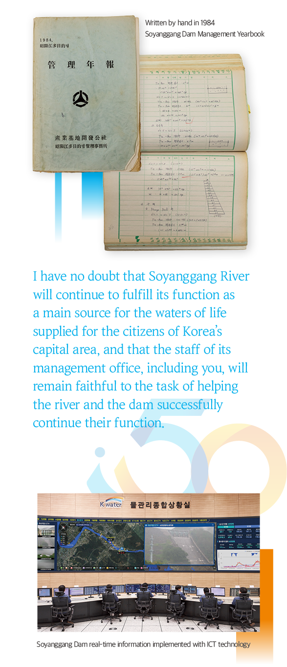 How are you, Mr. Yu? My name is Lee Du-hui, and I am working as deputy head of the department responsible for the management and operation of Soyanggang Dam. I was assigned to the current post last July and since then I have been busy like a hen with one chick, trying to deal with floods and algal bloom that struck the reservoir after the end of the rainy season. I see the photograph of a dam discharge scene hung on the wall of my office every day when I enter it for work. The picture was taken in 1981 as far as I know, and I wonder if you were working at the office at the time.