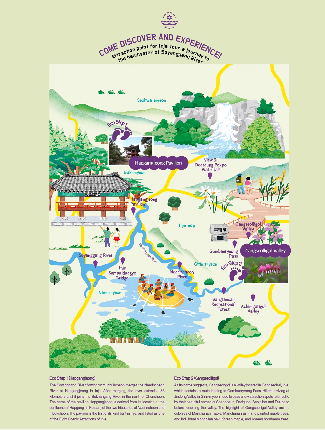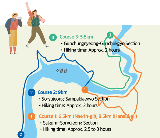 The name of the river, Soyanggang, reminds many citizens of Chuncheon city, the administrative center in the area around the river, but its headwaters and most of its upstream section is in Inje, Gangwon-do. The upstream section of the river is famous for a trail running along its banks, where its natural surroundings have been kept in pristine condition. The Soyanggang Trail was officially recognized as a national forest trail through a contest organized by the Ministry of Public Administration and Security. The trail consists of three courses, the first of which is 8.5km-long Haneul-gil, the second is 2.1km-long Naerin-gil, and the third is 4.9km-long Soyanggangbyeon-gil.