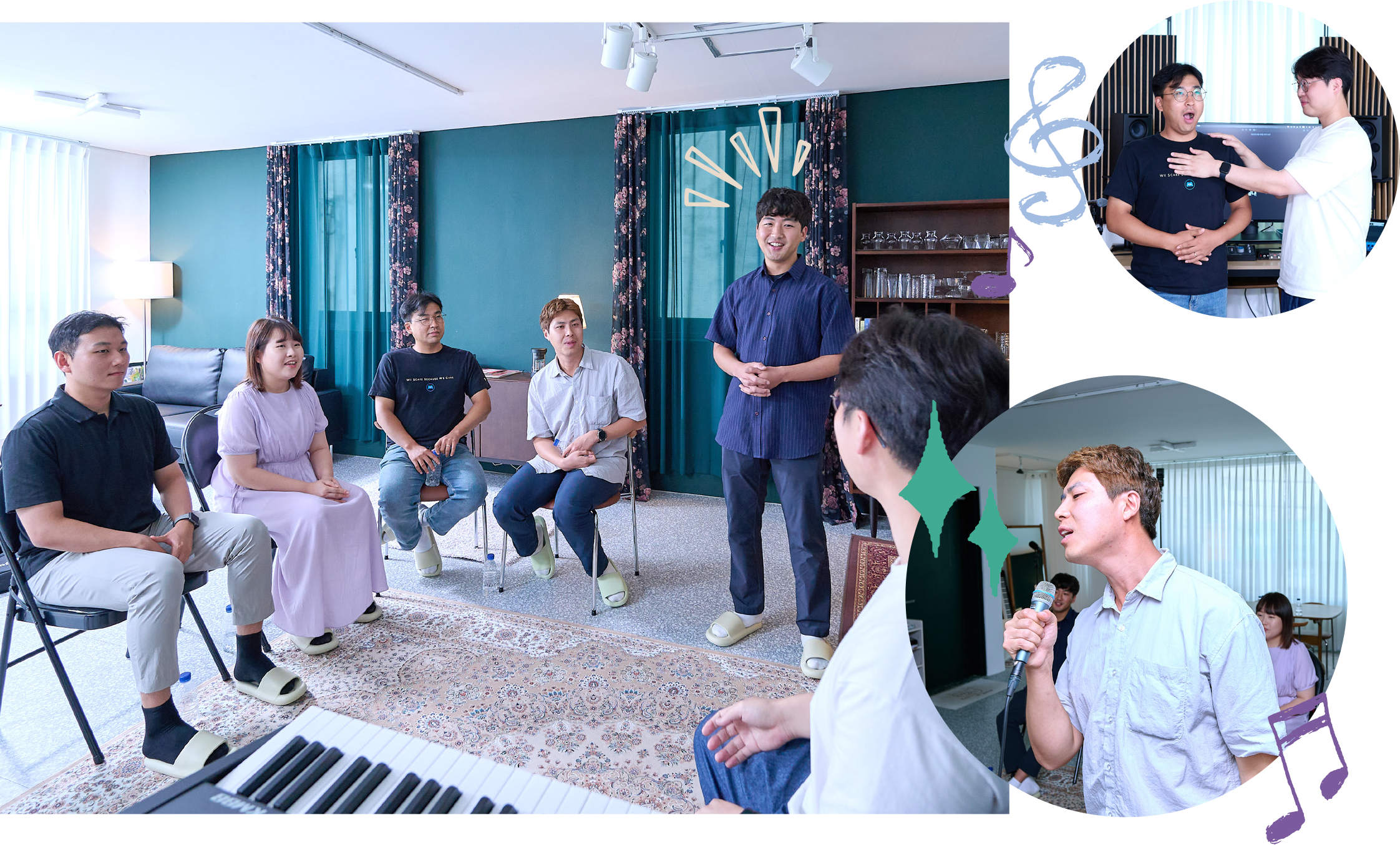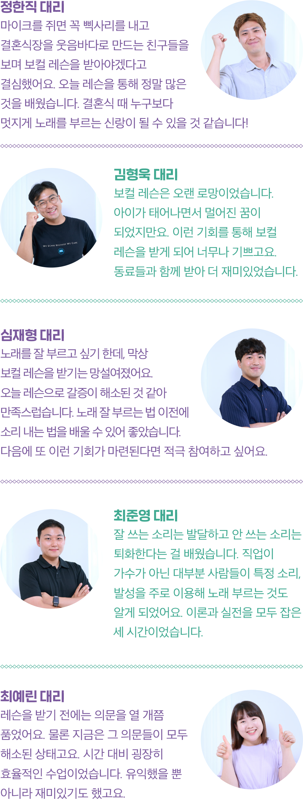 “좋은 가수란 탄생하는 것이 아니고 만들어지는 겁니다. 오늘 여기 모인 모든 분에게 좋은 가수가 될 수 있는 DNA가 있어요. 저를 믿으셔야 합니다.” 한때 유행했던 TV 드라마의 입시 코치를 방불케 하는 트레이너의 당찬 말에 5인방의 눈동자가 초롱초롱 빛난다. 호기롭게 도전 의사를 밝힌 이들은 바로 동두천수도지사 유수율제고팀 정한직 대리, 관망관리팀 최준영 대리, 설비운영팀 심재형 대리, 고객지원팀 최예린 대리, 그리고 누구보다 보컬 레슨이 간절했던 공정관리팀 김형욱 대리다. 오늘 보컬 레슨은 원데이 레슨인만큼 발성부터 노래까지, 전반적인 부분을 다루는 수업으로 진행되었다. 1세대 보컬 트레이너로 잘 알려진 가수 박선주에게 사사한 조현빈 트레이너가 이들의 목소리 조련사를 자처했다.
