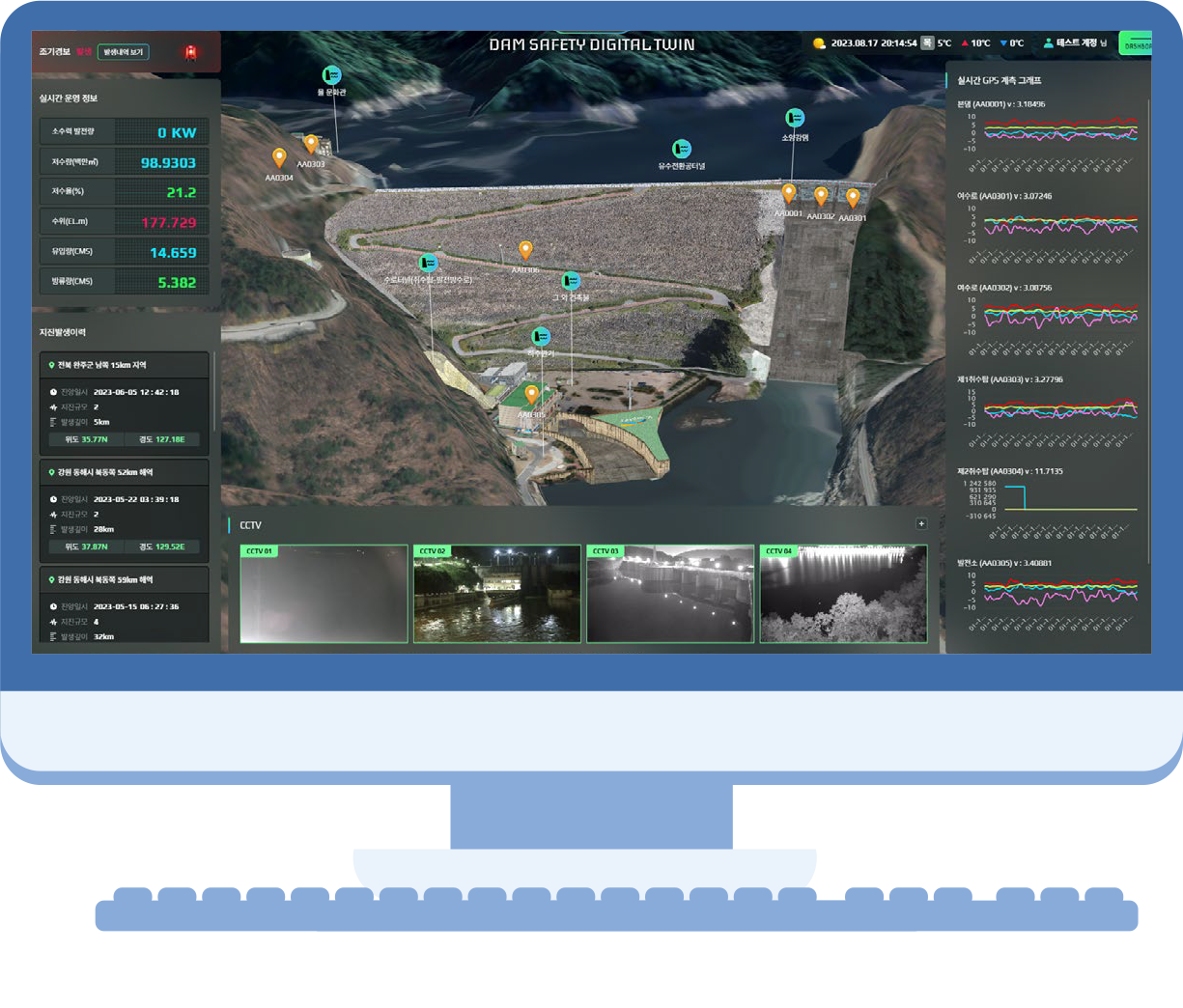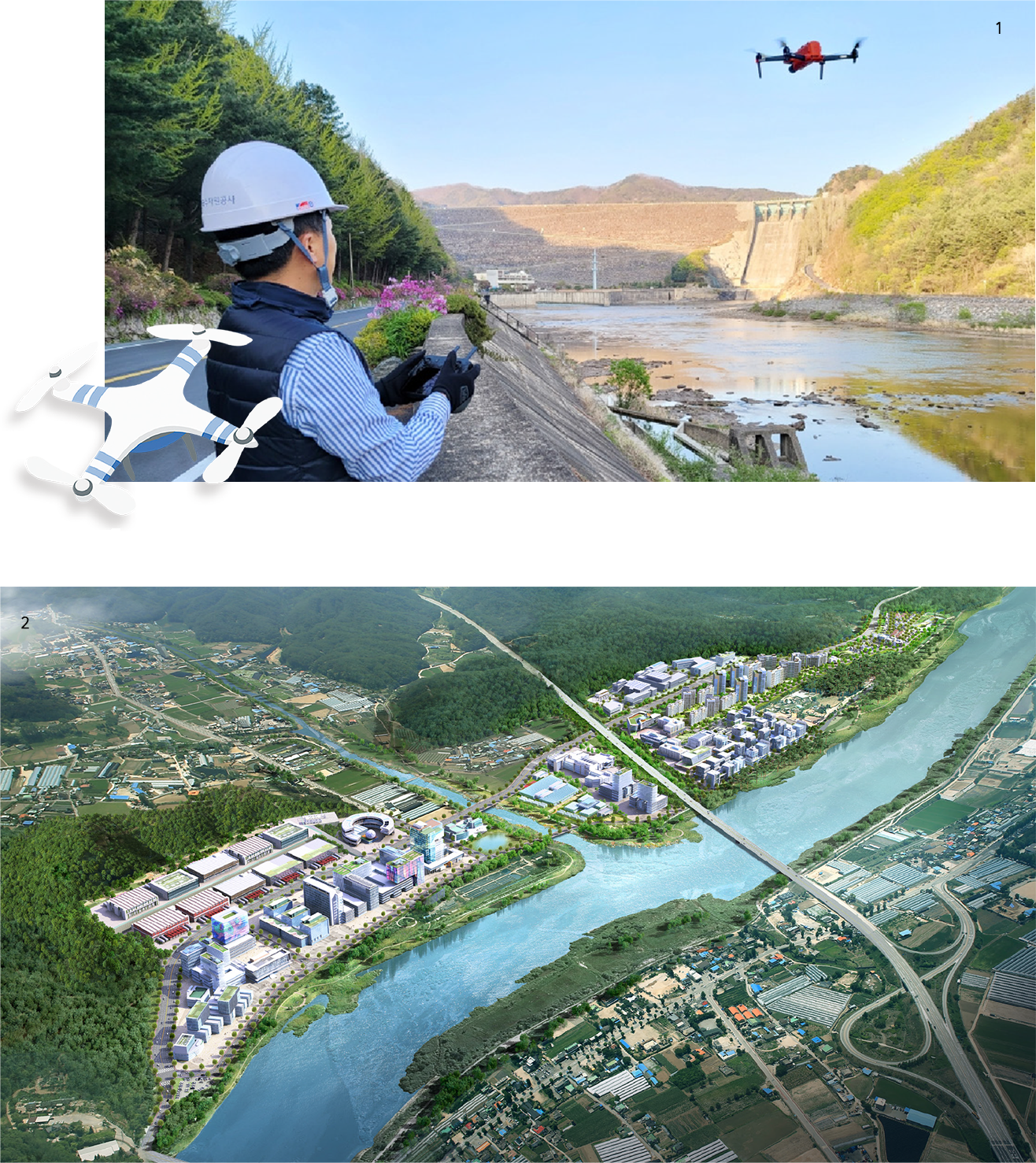At present, the need for dams is emphasized now more than ever as the frequency of extreme droughts and floods increases due to abnormal weather caused by climate change. Accordingly, Soyanggang Dam aims to reinforce the existing water management system and promote innovative changes through digital transformation. As a representative example, K-water has been operating the ‘Digital GARAM+,’ the digital twin*-based water management platform it built in 2021. Digital GARAM+ is a technology that connects various types of water management data in real time to a 3D digital virtual world—which replicates the real world—and simulates various scenarios for flood occurrence in advance in order to aid in decision making for optimal water management. This is the world’s first digital twin-based water management platform. Starting with the Seomjingang River basin, K-water plans to expand it to all five major rivers including the Hangang River, Geumgang River, Yeongsangang River, and Nakdonggang River basins so as to prevent disasters and strengthen flood control functions through the water management platform by the end of this year. In addition, K-water is introducing “smart dam safety management” through real-time intelligent surveillance (smart monitoring), drone-based (aerial and underwater) safety inspection, and establishment and operation of a dam BIM-based integrated safety management system. Established using Fourth Industrial Revolution technology, the smart dam safety management system is being promoted with the goal of 37 dams in Korea including Soyanggang Dam being able to respond preemptively to natural disasters such as earthquakes and floods.