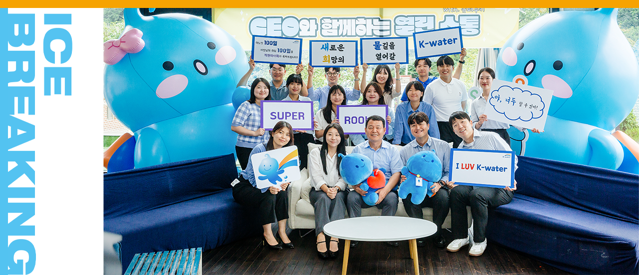 ‘여러 공기업 중 하나!’. 제가 그동안 K-water에 갖고 있던 이미지는 딱 이 정도였던 것 같아요. 취임 후 100일을 보낸 지금, ‘조금 아깝다’는 것이 저의 달라진 생각입니다. 진심입니다. 취임 후 조직을 자세히 들여다보고 구성원들을 만나고 나니 우리 만한 인적 구조, 재무 여건, 독자적인 사업과 포트폴리오를 갖춘 기업이 없더라고요. 이대로 두기에는 아까운 기업이라는 생각과 함께, 삼성하면 반도체를 떠올리듯, K-water를 글로벌 물 분야에서 독보적인 위상을 가진 기업으로 만들고 싶다는 욕심이 생겼습니다. 임기 동안 완벽한 결과를 만들어 내기는 쉽지 않겠지만, 최소한 내가 초석은 깔 수 있겠다는 확신이 들었어요. 우선 우리는 공기업인 만큼 국민의 생명과 재산을 보호하고 안전한 물관리를 하는 것이 첫번째 사명입니다. 그 바탕 위에서 글로벌 기업으로 도약할 수 있는 능력이 우리에게 있다고 생각합니다. 취임 후 100일 동안 제가 보고 듣고 느낀 여러분의 모습 속에서 그 가능성을 확인할 수 있었습니다. 지금 저에게는 우리 K-water, 그리고 직원들에 대한 신뢰가 자리하고 있습니다. 그 신뢰를 바탕으로, 제 임기 동안 글로벌 기업으로 도약할 수 있는 발판을 만들고 싶습니다.