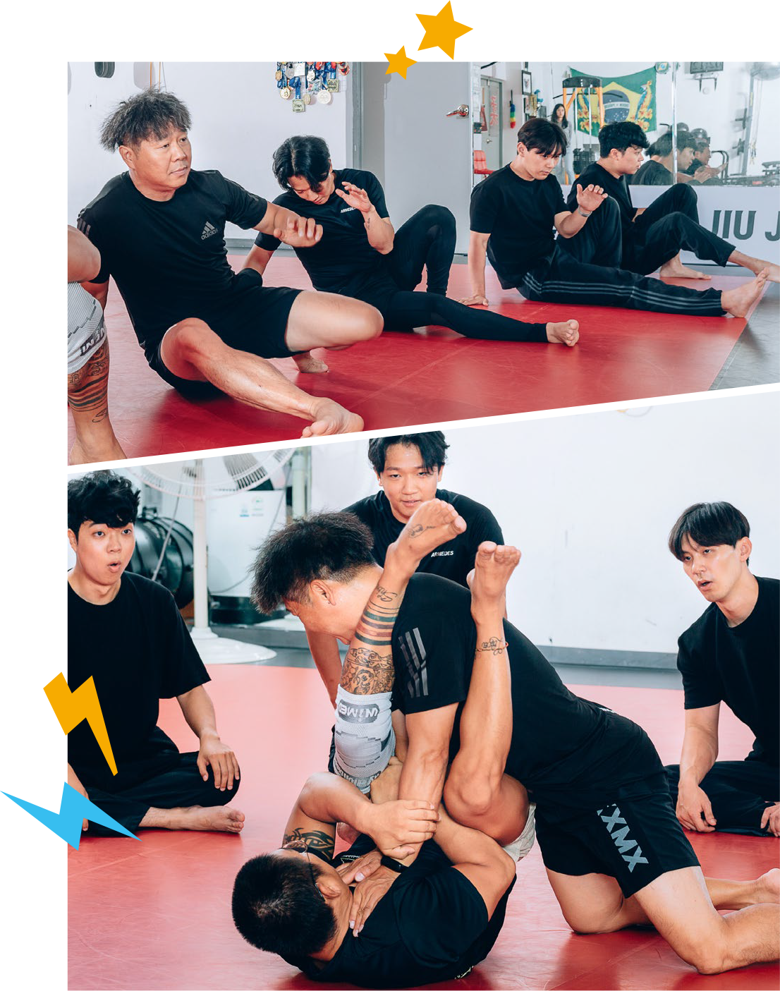 주짓수란, 일본의 전통 무술인 ‘유술(じゅうじゅつ, 쥬쥬츠)’이 브라질을 시작으로 서양으로 전파되면서, 발음이 변형되어 오늘날에 이르러 Jiu-Jitsu(주짓수)로 불리게 되었다. 오늘 체험을 진행한 춘천의 한 도장은 브라질 주짓수를 전문으로 배울 수 있는 곳이다. 브라질 주짓수는 20세기 중반부터 시작되어 유명 격투가인 호이스 그레이스를 통해 잘 알려지게 되었다. 요즘처럼 ‘묻지마 범죄’ 소식이 끊이지 않는 시기에 자신을 지키는 호신 기술 하나 정도는 필수일 터. K-water 소양강댐지사 4인방도 위급 상황을 대비한 호신 기술을 배우기 위해 주짓수 체육관을 방문했다. 도장에 도착하자 신나는 음악이 이들을 맞이했다. 이번 주짓수 체험 참가자는 소양강댐지사 운영부 이상현 사원, 홍성재 대리, 관리부 홍철호 선장, 그리고 녹조로 일이 바빠 리프레쉬가 절실했다던 운영부 성한수 사원으로 꾸려졌다. 이번 체험은 몸풀기부터 기본 동작, 실제 위급 상황에 사용되는 공격 기술까지 주짓수 전문가인 신동우 사범의 지도로 진행되었다.