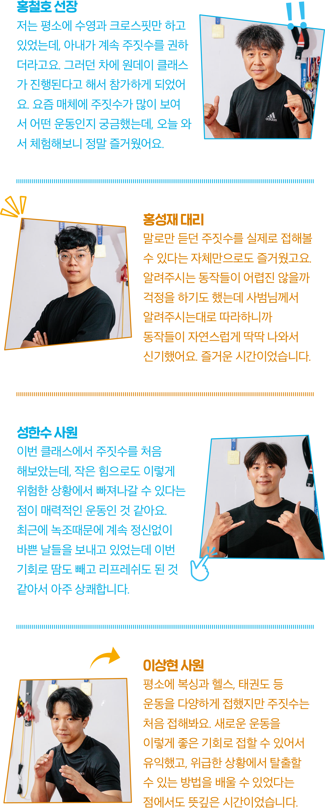 ‘호신(護身)’은 말 그대로 ‘내 몸을 지킨다’는 뜻이다. 주짓수는 다른 운동에 비해 ‘호신’의 성격이 좀 더 강하다. 누군가 갑자기 나를 공격하는 일은 내 힘으로 막을 수 없다. 그렇다면 이 막을 수 없는 상황에서 내가 할 수 있는 일은 무엇일까? 이번 주짓수 원데이 클래스는 막을 수 없는 상황에서 내가 할 수 있는 일을 찾기 위한 시간이었다. 운동을 전문적으로 배우지 않은 일반인들이 위급한 상황에서 큰 힘을 발휘할 수 있는 가능성은 매우 적다. 이런 점에서 주짓수는 비전문가들에게도 매우 유익한 운동이다. 적은 힘으로 큰 공격을 할 수 있는 효율적인 동작이 많기 때문이다. “작은 힘으로도 위험한 상황에서 탈출할 수 있다는 점이 주짓수의 매력이라고 생각해요.” 성한수 사원의 말이 위험한 상황을 겪을 수 있는 모든 비전문가들의 입장을 대변한다. 이번 주짓수 체험은 원데이 클래스였지만, 참가자들이 배운 동작은 오랫동안 그들의 안전을 지켜줄 것이다.