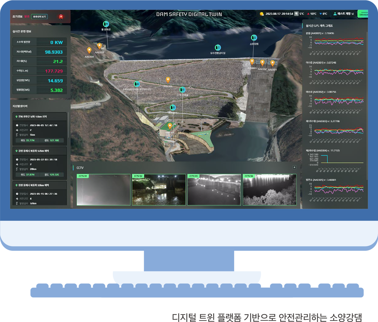 1970년대 국가 경제발전과 국민 안전의 초석이 된 소양강댐. 원활한 용수 공급과 홍수조절을 통한 재해 방지, 가뭄 극복 등 국가의 경제와 안보에 중추적인 역할을 수행해 왔다. 2023년, 준공 50주년을 맞은 소양강댐에는 어떤 변화가 생겼을까? 급변하는 기후위기에 댐의 역할이 더욱 중요해지고 있는 오늘날, 소양강댐은 스마트 물관리의 요람으로 재탄생하고 있다.기후변화에 따른 이상기후로 극심한 가뭄과 홍수 등의 빈도가 잦아져 댐의 필요성이 더욱 강조되고 있는 지금, 소양강댐은 기존의 물관리 체계를 보완하고 디지털 전환을 통한 혁신적인 변화를 도모하고 있다. 대표적인 사례로, K-water는 지난 2021년부터 디지털 트윈* 기반의 물관리 플랫폼인 ‘Digital GARAM+(디지털 가람플러스)’를 구축해 운영하고 있다. ‘Digital GARAM+’는 현실세계를 복제한 3차원 디지털 가상세계에 각종 물관리 데이터를 실시간으로 연결하고, 홍수 발생 등에 대한 다양한 시나리오를 사전에 시뮬레이션하여 최적의 물관리 의사결정을 지원하는 기술이다. 이는 세계 최초의 디지털 트윈 기반의 물관리 플랫폼이며, 섬진강 유역을 시작으로 한강, 금강, 영산강, 낙동강 유역 등 소양강댐을 포함한 5대강 전역으로 올해 말까지 확대하여 물관리 플랫폼을 통한 재해 예방과 홍수조절 기능을 더욱 강화하고자 한다. 이와 더불어 실시간 지능형 감시(스마트 모니터링), 드론 기반(항공 및 수중) 안전점검, 댐 BIM 기반 통합안전관리시스템 구축·운영 등을 통해 ‘스마트 댐 안전관리’를 도입하고 있다. 4차산업혁명 기술을 도입한 스마트 댐 안전관리는 소양강댐을 포함 국내 37개 댐이 지진이나 홍수 등의 자연재해로부터 선제적인 대응능력을 갖출 수 있도록 하는 것을 목표로 추진 중이다.