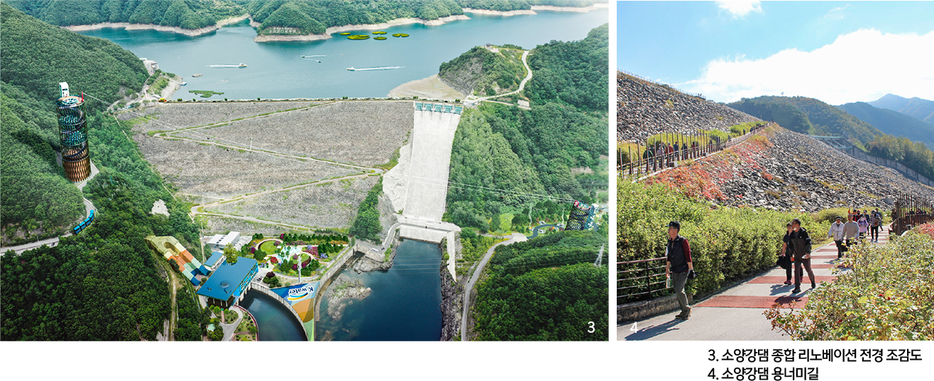 반세기 동안 중추적인 역할을 하며 우리에게 없어서는 안 될 존재로 자리매김한 소양강댐. 이제는 전통적인 물관리 측면뿐만 아니라 미래지향적이고 지속가능한 댐 관리 방향을 설정해야 할 때이다. K-water는 소양강댐 준공 50주년을 맞아 댐 및 주변 공간의 가치를 극대화할 수 있도록 노력하고 있다. 댐이 지역사회와 상생하는 국민행복 공간으로 발돋움할 수 있도록 댐의 경관을 개선하고 지역 발전에 더욱 기여하기 위해 소양강댐 종합 리노베이션 사업을 추진하고 있는 것. 관광명소로서의 소양강댐이 제 역할을 더욱 발휘할 수 있도록 노후 시설 공간디자인과 야간 조명을 개선하고 전망공간을 조성하는 등 방문객들의 편의 증진을 위해 노력하고 있다. 또한, 댐 기능 강화를 위한 스마트 모니터링 시스템 등의 구축으로 보다 원활한 안전점검 체계를 갖추고, 저수지 내 보호종들의 서식처 복원 및 개선도 추진 중이다.