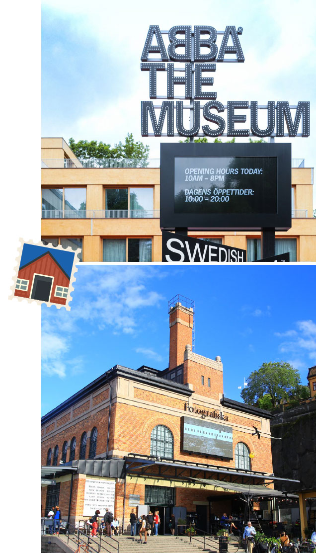 초록의 박물관 섬, 유르고르덴유르고르덴은 17세기 후반 왕실 사냥터였던 섬으로 여전히 숲과 언덕이 어우러진 목가적인 풍경이 남아 있다. 섬 안에 다양한 박물관이 모여 있어 ‘박물관 섬’이라고 불린다. 섬 초입에서부터 스웨덴 최대 문화사 박물관, 노르디스카 무제트가 있어 16세기부터 현대에 이르는 의복 가구와 17세기에 건조한 배 바사호를 살펴볼 수 있다. 노르디스카 무제트 근처에 스웨덴 태생 보드카 앱솔루트에서 운영하는 스피릿 박물관과 스웨덴의 국민 밴드 아바를 기념하는 아바 박물관도 있다. 스피릿 박물관에서는 보드카의 역사와 제조 과정을 살펴볼 수 있고, 아바 박물관에는 아바 멤버들의 의상과 음반 등 전시품을 관람할 수 있다.