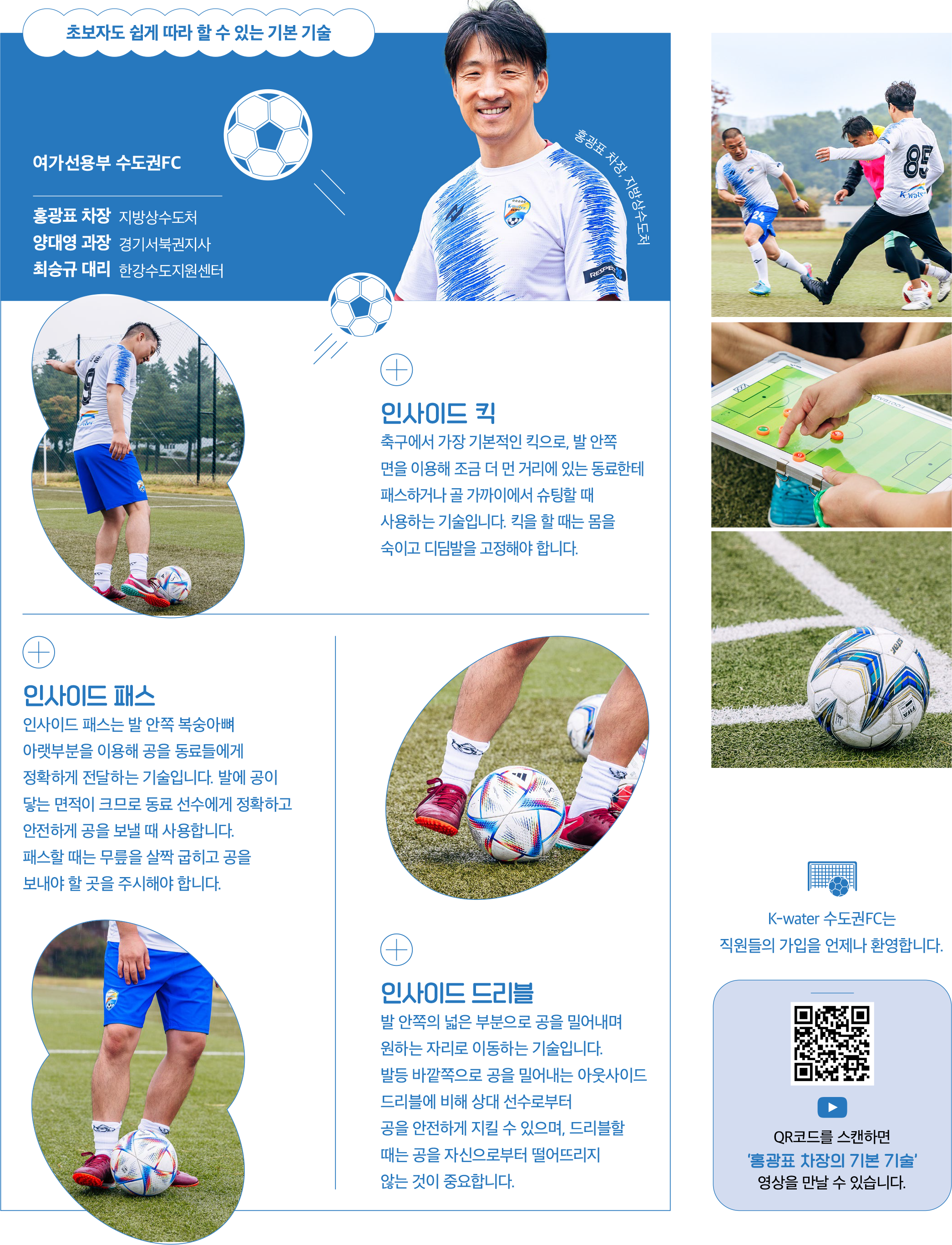 2001년에 설립된 K-water 여가선용부 수도권FC도 같은 취지로 모임을 진행하고 있다. 파주, 남양주, 화성, 인천 등 수도권 지역에서 축구를 좋아하는 회원들이 매월 둘째 주와 넷째 주 주말 오전에 모여 축구 모임을 진행한다. 그간 개최된 국토부, 환경부 장관기 대회에 출전할 수 있는 우수한 선수들을 배출하고, K-water 사내에서 개최된 각 본부별 축구대회에서 많은 우승을 거머쥐는 등 프로페셔널한 스포츠 클럽으로 도약하고 있다. K-water 여가선용부 수도권FC를 이끄는 지방상수도처 홍광표 차장은 2010년 K-water 물사랑 축구대회에서 최우수선수상을 받은 실력자다. 그는 수도권FC 활동을 통해 직군이나 나이를 떠나 운동장에서 함께 땀을 흘리며 직원들과 친목을 도모할 수 있고, 다양한 정부 기관과 친선 경기를 통해 네트워크를 구축할 수 있다는 점을 동호회 활동의 장점으로 꼽았다.
