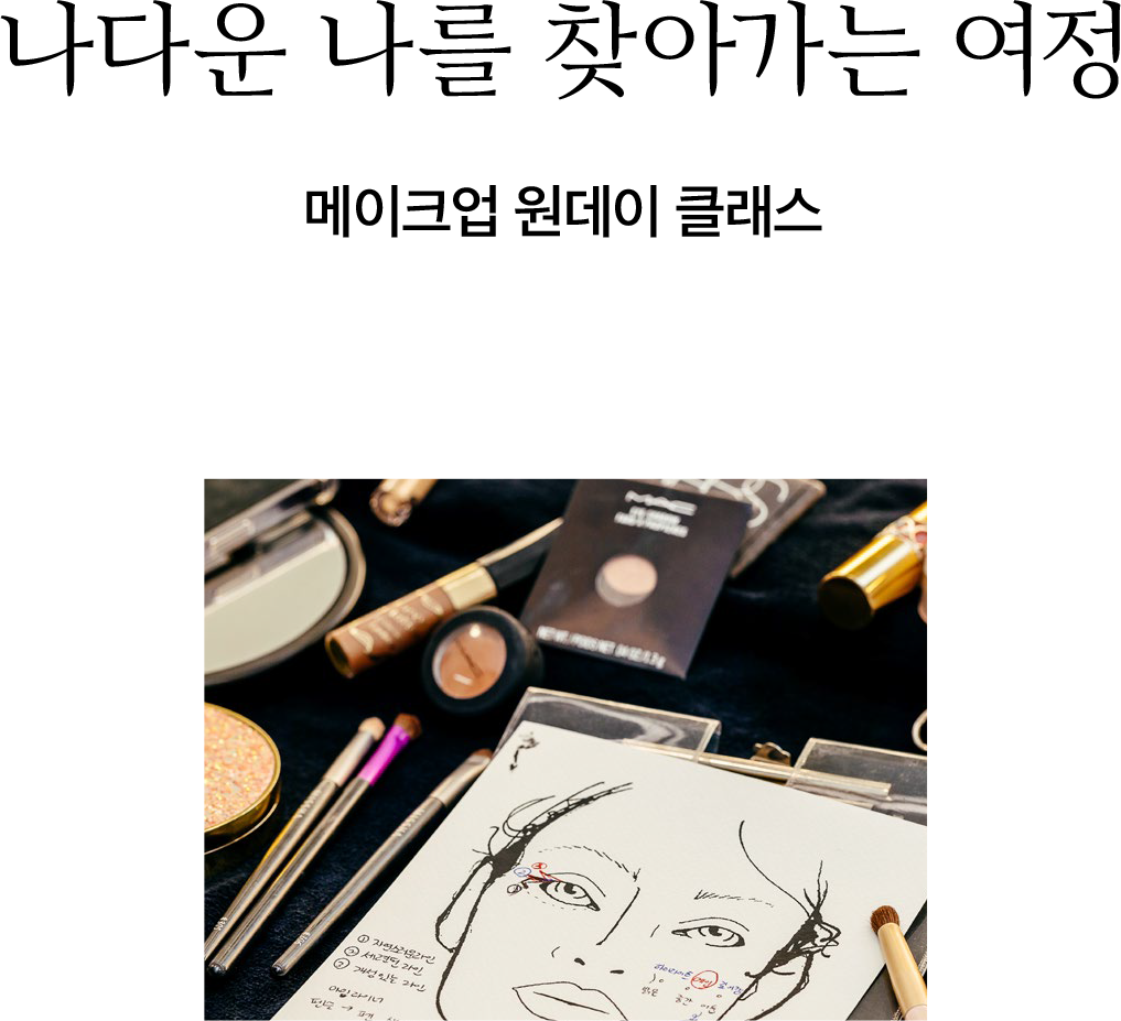 메이크업 클래스의 시작은 메이크업 제품이나 도구 사용법을 공부하는 것이 아닌, 내 얼굴을 오롯이 마주하는 것이었다. 거울을 들고 내 눈꼬리가 위를 향하고 있는지 아래를 향하고 있는지, 눈썹은 어떤 방향을 향하고 있는지 얼굴 구석구석을 자세히 관찰한다.