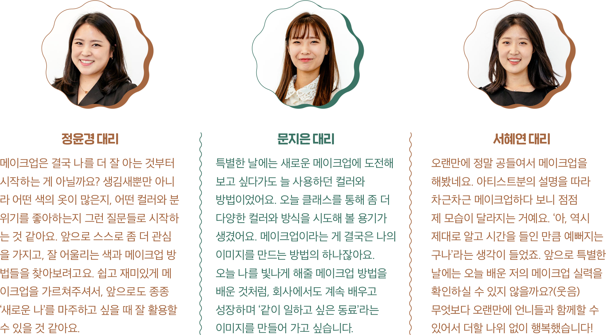 대학생 때는 메이크업에 관심이 많았지만, 이제는 특별한 날이 아니고는 선크림만 바른다는 정윤경 대리, 매일 메이크업을 하지만 최소한의 제품만 사용해 10분이면 충분하다는 문지은 대리, 메이크업하면 괜스레 기분이 좋아서 열심히는 하는데 ‘잘’하지는 못한다는 서혜연 대리. “나에게 잘 어울리는 메이크업 방법을 배워서 좀 더 아름다워지겠다”는 목표와 함께, 오늘의 클래스가 시작됐다.
