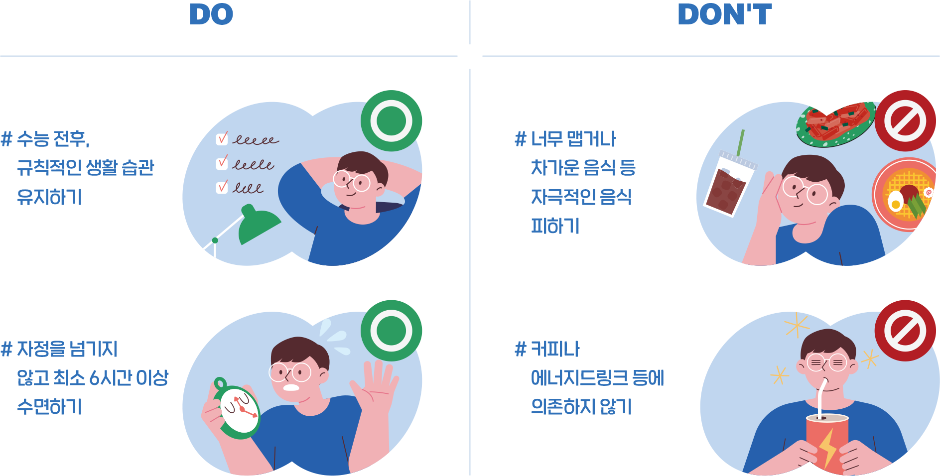 가까워진 대학수학능력시험에 마음이 조급해 끼니를 거르거나 수면 시간을 대폭 줄이는 등 갑작스레 생활 습관은 바꾸는이들이 있다. 하지만 가장 중요한 것은 규칙적인 생활 습관이다. 기존의 공부해 오던 스타일과 평정심을 유지하고 적절한 수면시간을 통해 규칙적인 생활 습관을 유지해야 시험 당일에도 긴장하지 않고 평소대로 임할 수 있다. 특히 규칙적인 수면시간은 적절하게 뇌가 휴식할 수 있는 시간을 줌으로써, 낮에 집중력과 기억력, 판단력 등을 높이는 데 도움이 된다. 적절한 수면시간은 자정을 넘기지 않고 잠들어 최소 6시간 정도의 수면시간을 유지하도록 한다. 하나 더, 규칙적인 식사는 위산이 제때 분비되어 원활한 소화를 돕는다. 식사를 할 때는 너무 맵거나 차가운 음식 등 자극적인 음식을 피하고, 두뇌에 필요한 영양을 주는 베리류, 등 푸른 생선, 다크 초콜릿, 녹색 채소, 견과류 등을 섭취한다. 또한 잠을 깨우려는 용도로 커피나 에너지드링크에 의지할 경우 두근거림이나 현기증을 유발해 집중력을 흩트릴 수 있으니 유의해야 한다.