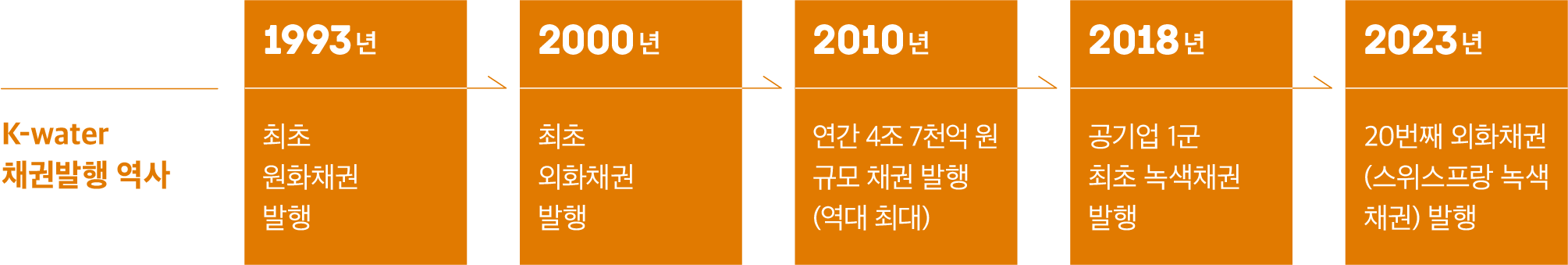 K-water는 2018년, 2022년 글로벌 금융 전문지 ‘디 에셋(The Asset)’이 선정한 ‘디 에셋 트리플 에이 어워드’ 최우수 그린본드상을 수상한 바 있다. 이는 K-water의 물관리 역량의 지속가능성과 친환경적인 성과를 국제적으로 인정받은 결과라 할 수 있다. 30년에 걸친 채권발행 경험과 이를 기반으로 한 국제적 평가와 재무건전성, 성장 잠재력 등으로 꽃피운 K-water의 그린본드. 이번 채권 발행으로 조달된 자금은 이상기후로 인해 증가한 가뭄이나 홍수 등의 물 재해를 저감하는 데 투자할 계획으로, 수도 시설 대체, 재생에너지 확대 등 다양한 친환경 프로젝트를 진행할 예정이다.
