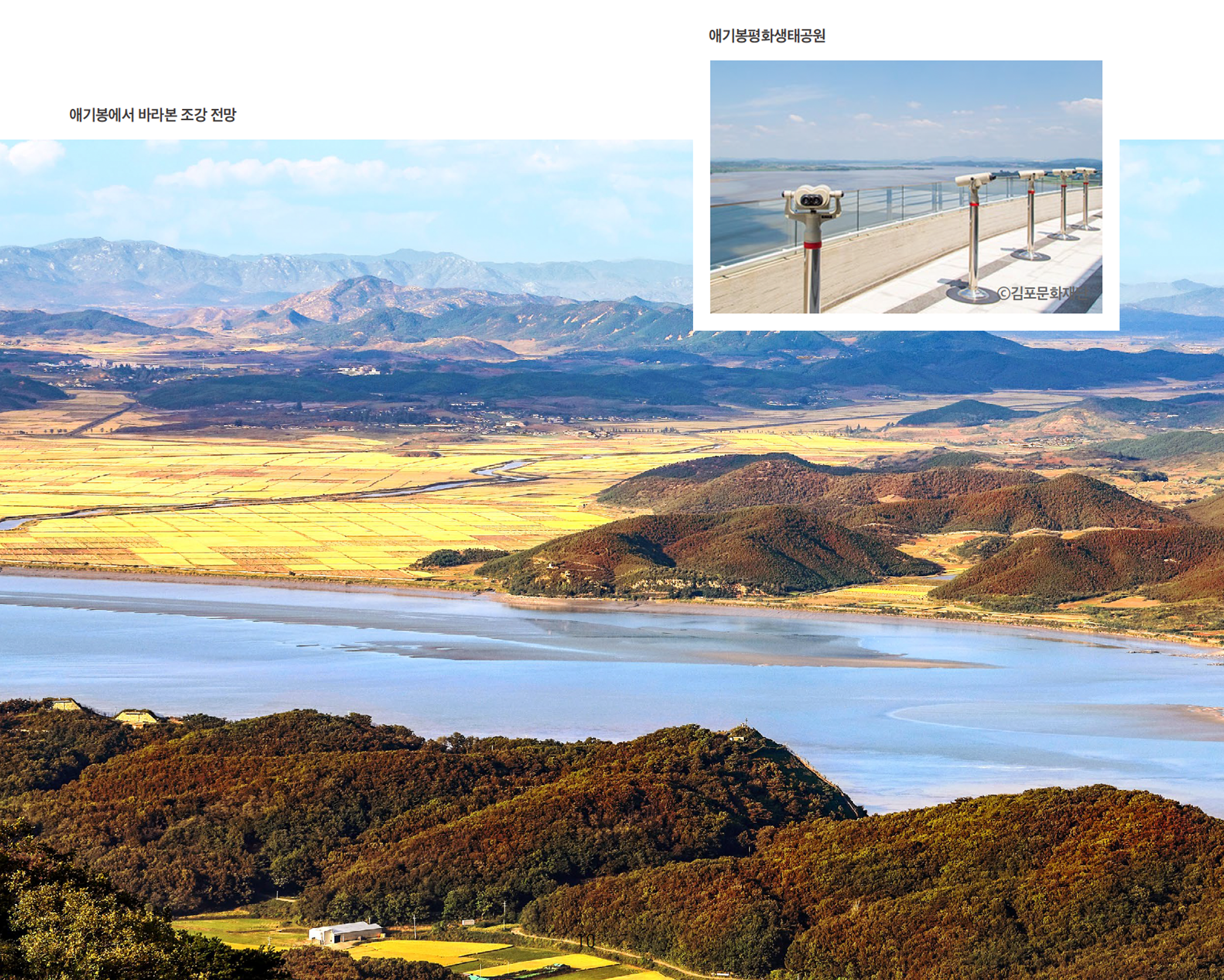 김포는 한강과 임진강, 예성강의 세 강줄기가 하나로 합쳐져 서해로 흘러가는 관문이었다. 김포 북쪽 끝자락에서 이를 굽어볼 수 있는 곳이 있다. 154m 높이의 야트막한 산봉우리인, 애기봉. 애기봉에서 강 건너를 보면 황해북도 개풍군이다. 거리가 1.4km밖에 되지 않아, 이곳에 오르면 김포가 왜 외적을 지키는 최전방이었는지 알 수 있다. 서해를 통해 침입하는 외적은 이곳을 지나지 않으면 한강으로 들어올 수 없었다. 한국전쟁 당시에는 남북이 치열하게 전투를 벌였던 154고지가 있는 곳이기도 하다. 애기봉에 방문한다면 애기봉평화생태공원을 추천한다. 기존의 노후화된 애기봉 전망대를 철거하고 2021년에 평화생태전시관, 조강전망대, 생태탐방로를 조성해 새롭게 단장했다. 세계적인 건축가 승효상 씨가 설계한 건축물과 주변의 자연경관이 아름답게 어우러져 평화가 가진 다양한 의미를 되새길 수 있는 공간이다.