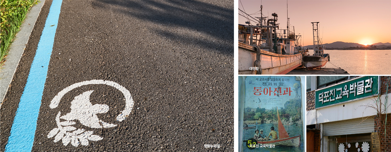 덕포진에서 20~30분 걸으면 바다와 닿은 대명항이다. 포구는 100여 척의 어선들이 오가며 분주한 풍경을 빚어낸다. 연안어업을 하고 어판장에서 직접 해산물을 판매하는 김포 유일의 지방어항이다. 봄이면 밴댕이와 주꾸미가 많이 올라오고, 가을이면 살찐 꽃게를 잡아 올린다. 주말 나들이를 가기 좋은 곳으로 갓 잡은 해산물을 싣고 내리는 어민들이 모습이 볼 만하다. 대명항 어시장은 꽃게를 비롯해 대하, 주꾸미 등 각종 신선한 해산물이 모이는데, 특히 김장용 새우젓과 멸치젓으로 유명하다. 대명포구에서 덕포진 교육박물관이 가깝다. 초지대교를 건너기 바로 직전에 있는 이곳은 1960~1970년대의 초등학교 모습을 재현해 놓았다. ‘전과의 왕 동아전과’도 있고 원더우먼이 그려진 양은 도시락도 있다. 오랜만에 보는 연필이며, 필통 등 학용품들이 반갑다. 풍금도 있다. 건반을 꾹 눌러본다. 옛 고등학교 추억이 새록새록 떠오른다.