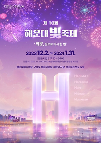 해운대의 대표적인 겨울 축제로, 올해 10주년을 맞은 해운대 빛축제. 올해는 특별히 백사장 미디어존을 운영해 더욱 신비로운 빛의 향연을 느낄 수 있다. 아름다운 빛 조형물 포토존과 다양한 프로그램을 즐기면서 해운대에서 잊지 못할 연말의 추억을 만들어 보자.