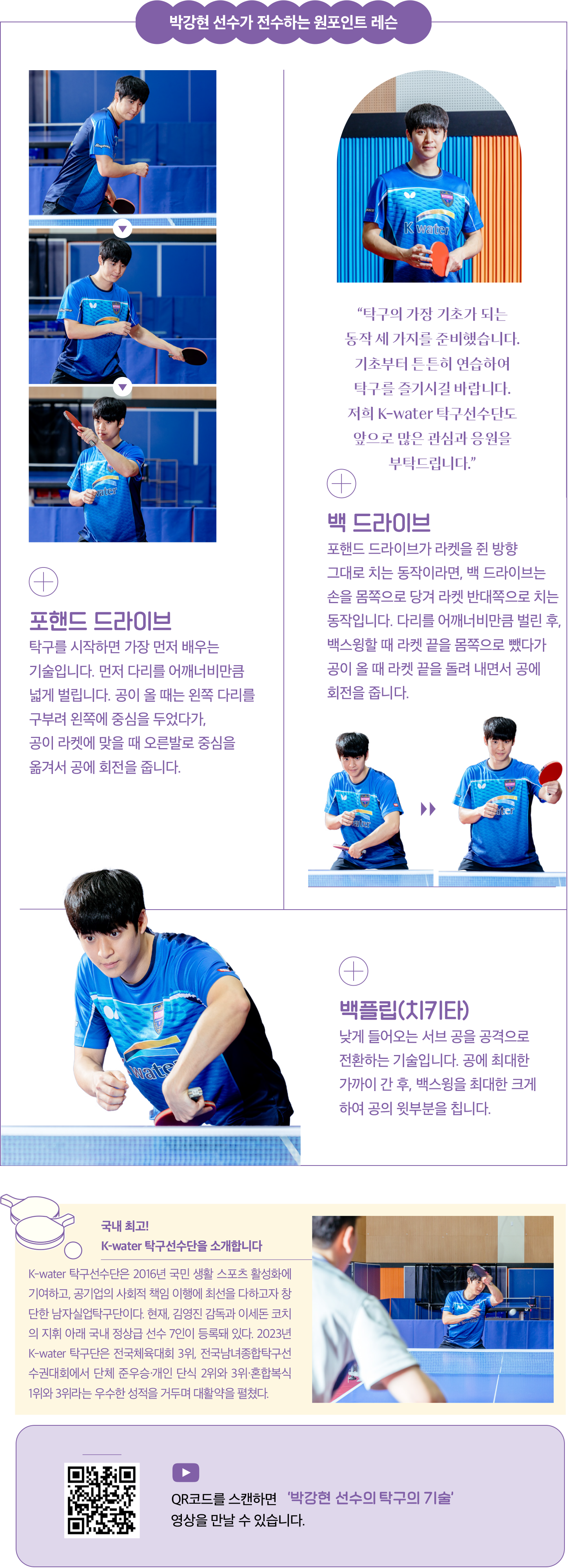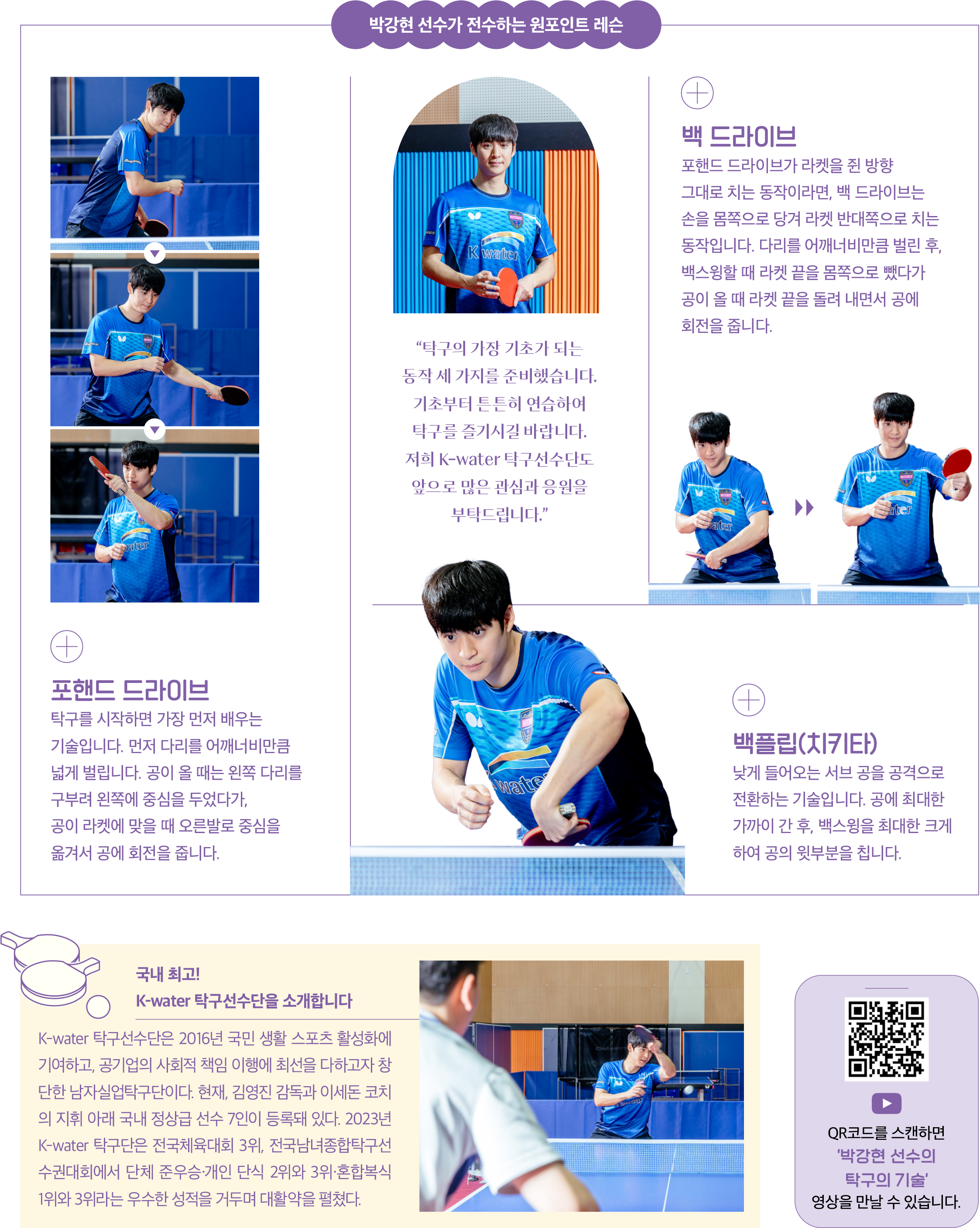 K-water 대전 본사 세종관 훈련장에 들어서자, 탁구단 소속 선수들이 내뿜는 후끈한 열기와 우렁찬 기합 소리가 가득하다. K-water 탁구선수단은 지난 2016년 창단 이래 전국체육대회와 전국남녀종합탁구선수권대회에서 활약하고 있다. 그중에서도 최근 들어 남다른 기세를 올리고 있는 탁구단의 에이스는 바로 박강현 선수다. 왼손잡이라는 장점을 십분 활용하는 동시에 어느 쪽 손으로도 국내 최고 스윙 스피드를 내는 박강현 선수. 2023년 올 한 해에만 평창아시아탁구선수권대회 단체 동메달과 개인 복식 동메달, 항저우아시안게임 단체 은메달 등을 목에 걸었다. 박강현 선수는 “메달로 팬들의 사랑에 보답할 수 있어서 기쁘고 뜻깊었습니다”라며 소감을 전했다.