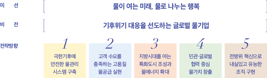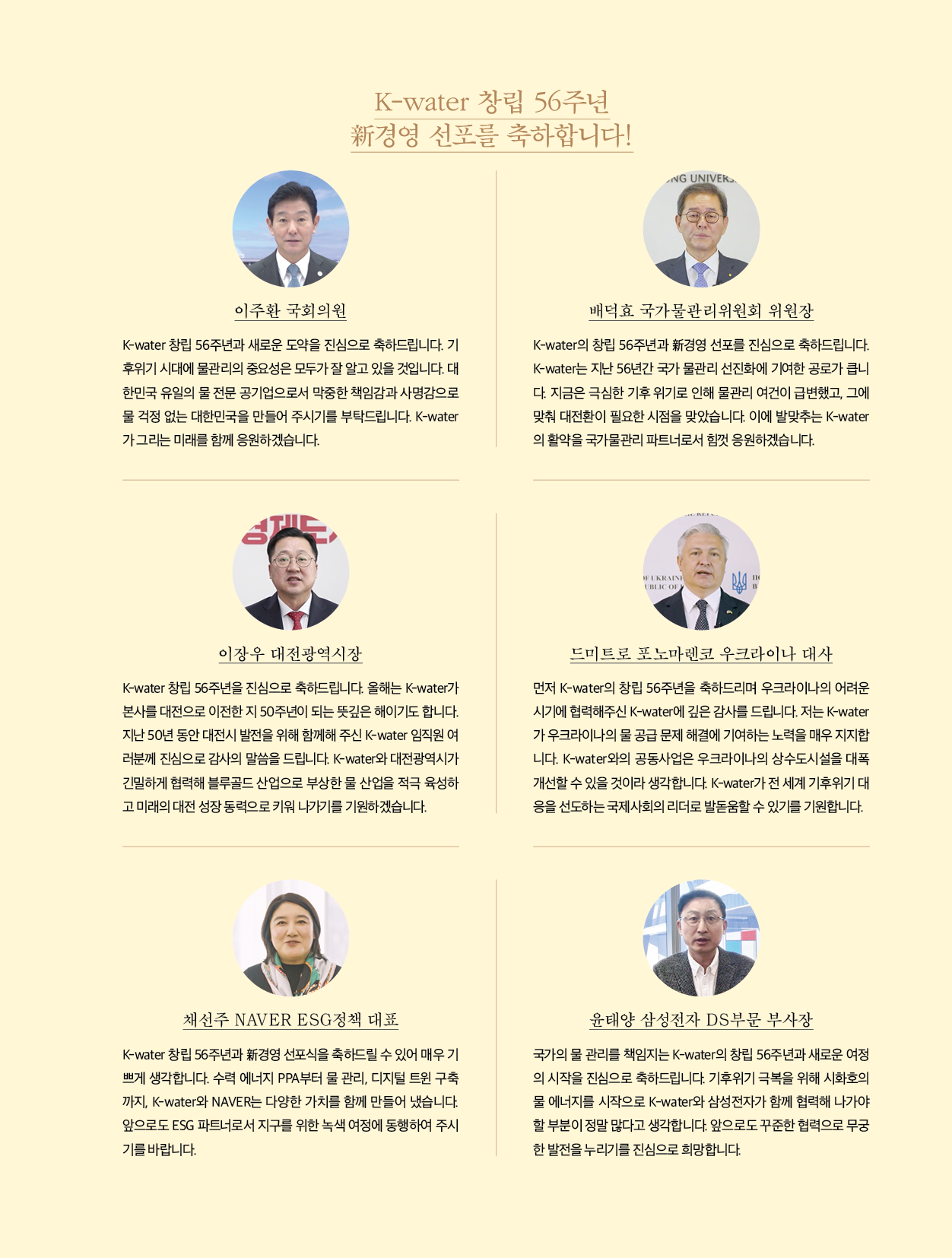 “기후위기 대응을 선도하는 글로벌 물기업 K-water가 만드는 도약과 행복의 새 역사, 흔들림 없이 국민이 안전한 새로운 물의 시대를 향해 나아갑시다.”