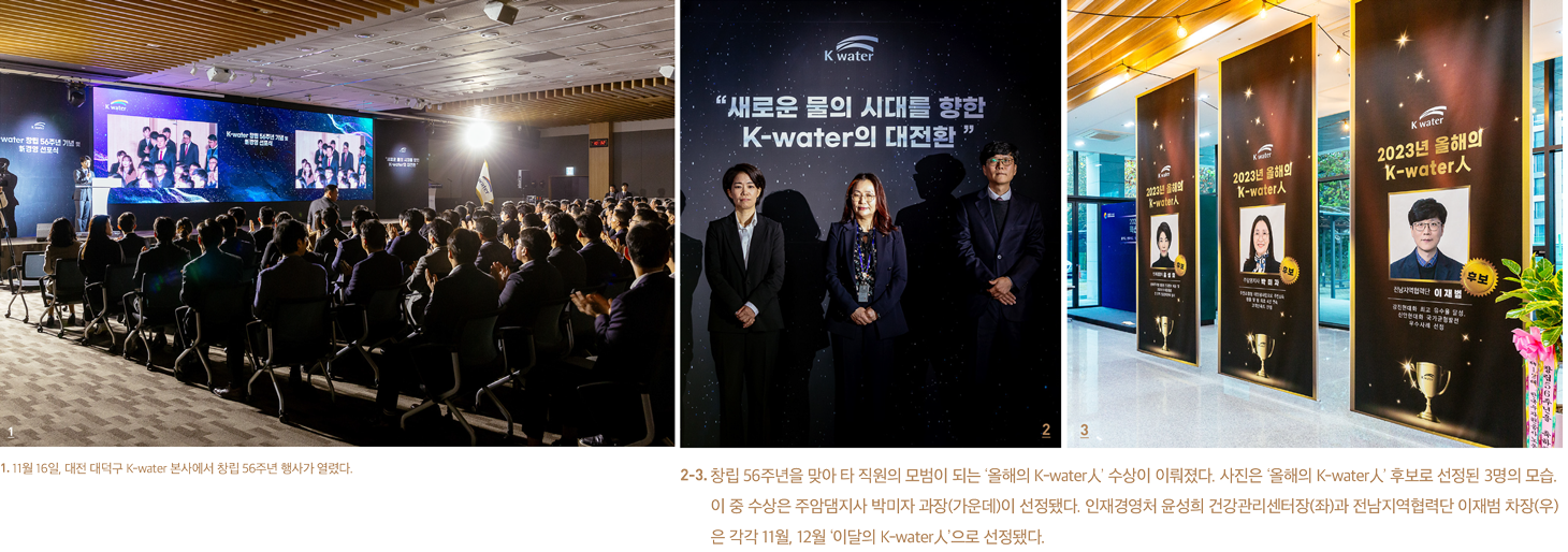 기후위기로 인해 물 환경이 급변하며 물관리의 중요성이 어느 때보다도 커진 오늘날. K-water는 또 한 번의 도약을 예고했다. 무엇보다 날로 심화하는 기상재해에 대응하여 국민이 안전한 물관리를 최우선으로 삼겠다는 다짐이다. 또한 물의 가치가 높아짐에 따라 물 산업 활성화로 녹색수출에 기여하고, 반도체 등 첨단기술로 산업이 재편되는 데 필요한 막대한 용수를 적기에 공급한다는 계획이다. K-water 윤석대 사장은 전 직원과 함께 이러한 목표를 담아 새로운 물의 시대로 나아가기 위한 新경영을 선포했다.
