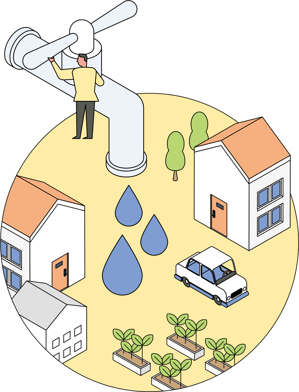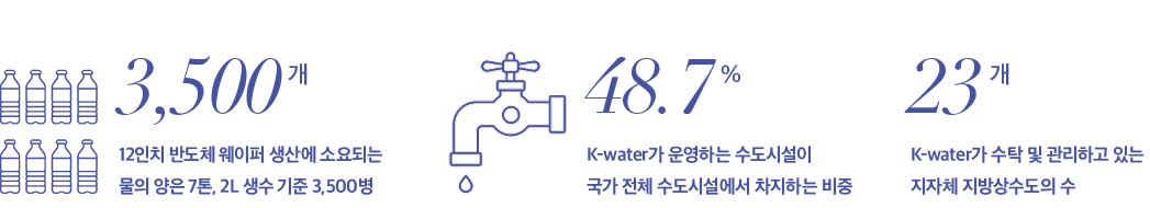 K-water는 국민이 체감하는 ‘상수도 혁신’에도 힘을 다한다. K-water는 그간 취수원부터 수도꼭지까지, 수도시설의 최적관리와 활용을 통해 모든 국민들에게 부족함 없이 깨끗한 물을 공급해왔다. 수도 분야는 지난 1973년 수도권 광역상수도 1단계를 시작으로 공업용수도, 지방상수도로 영역을 확장하며 K-water의 양적·질적 성장을 이끈 핵심이기도 하다. K-water는 50개의 광역상수도를 운영하며 국가 전체 수도시설 용량의 48.7%를 책임지고 있다. 또한 23개 지자체의 지방상수도를 수탁 관리하면서 국민에게 최고의 물서비스를 제공하고 있다. 앞으로도 국민이 믿고 마실 수 있는 깨끗한 수돗물 공급을 위해 원활한 수도시설 운영은 물론, 활성탄 비축 등을 통해 물공급에 리스크가 생기지 않도록 선제적 대응에 나설 예정이다. 또한 반도체 등 첨단산업 분야에서 글로벌 선도 국가로 도약하는 중대한 시기를 맞은 대한민국의 경제에 적극 기여한다. 국가와 산업이 요구하는 맞춤형 고품질 용수 공급에 힘쓰는 것. 댐과 같은 전통적 수자원을 최적으로 활용하는 동시에 첨단수처리 기술을 확보하여 재이용, 해수담수 등 대체수자원 확대를 위한 노력을 이어 나갈 예정이다. 한편, 대한민국은 현재 지방인구 감소 등으로 지역소멸의 위기를 겪고 있다. 지자체가 독자적으로 발전방안을 모색하기에는 어려움이 있는 것이 사실. 이에 지역상생 협력을 위해 K-water가 나선다. 살기 좋은 지방시대를 열어가는 물 복지 차원으로, 지방상수도 운영을 효율화하고 현대화사업 등 보편적인 물 복지를 실현하고자 하는 것. 더불어, 물순환과 에너지자립 등 지역 특화 스마트 도시를 조성해 기후변화에 강하고 매력 넘치는 지역으로 발전시키고자 한다.