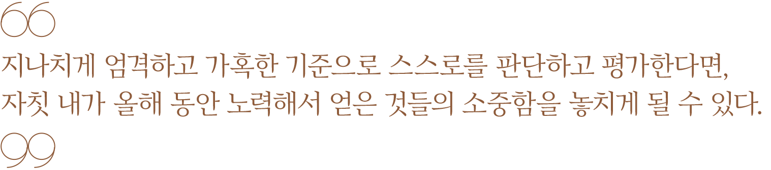 세 번째, 살아가면서 어느 정도의 후회와 아쉬움을 느끼는 것은 필요하다. 적절한 결핍과 좌절 경험이 존재해야 동기부여도 되고, 도전적인 태도를 가질 수 있기 때문. 후회라는 감정에 너무 매몰되지만 않는다면, 더 나은 삶을 위한 강력한 엔진이 될 수 있다. 다만 지나치게 엄격하고 가혹한 기준으로 스스로를 판단하고 평가한다면, 자칫 내가 올해 동안 노력해서 얻은 것들의 소중함을 놓치게 될 수 있다. 무결점의 완벽한 상태라는 것은 실제로 존재하지 않는 환상에 가깝다. ‘이만하면 괜찮은 한 해’라고 생각하면서 올해도 충실하게 살아온 나를 위로하고 격려하는 태도가 필요하다.