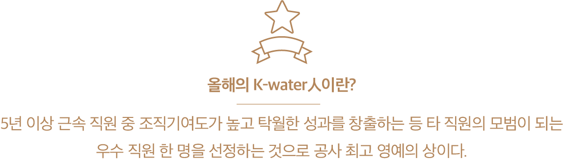 여기까지 도달할 수 있도록 많은 분들이 응원해주셨고 그 덕분에 이 자리에 있다고 생각합니다. 처음 입사했을 때 다짐했던 그 마음으로 하루하루 초심을 잃지 않고 묵묵히 달려오다 보니 이런 영광의 날이 온 것 같아 정말 감사하고 기분이 좋습니다. 좋은 환경 속에서 맘껏 일할 수 있어서 너무 행복했고요. 앞으로 남은 재직기간 동안 K-water가 더 빛날 수 있도록, 자랑스러운 K-water人으로서 최선을 다해 노력하겠습니다.