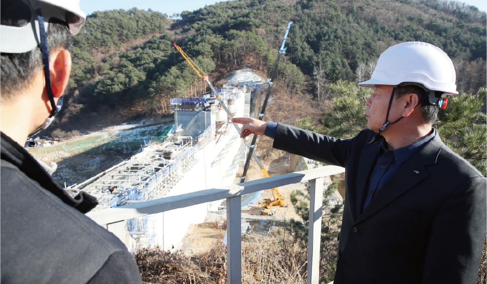 K-water president Yun Seog-dae visited on December 1, 2023 the construction site of Wonjucheon Dam, the first dam to be built at the request of local residents scheduled for completion in 2024. Ahead of the visit, President Yun also visited the Hoengseong Wonju Branch Office and checked key facilities including Hoengseong Dam and Seongjeon Water Purification Plant for wintertime preparedness. The Wonjucheon Dam currently under construction is a flood-control facility with water storage capacity of 1.8 million tons, which will help prevent floods at the lower stream of Wonjucheon River. The Wonjucheon river basin has been highly susceptible to human casualties and property damages due to frequent torrential rains, and the local community requested that the dam be constructed to cope with chronic flood issues.