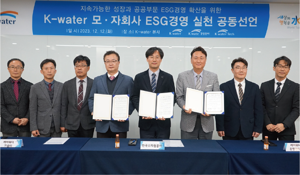 K-water and subsidiaries K-water OMC and K-water Tech held the parent-subsidiary joint declaration ceremony on December 12 for the spread and implementation of ESG management at K-water’s headquarters. The declaration was intended to contribute to making a better world through water and sustainable growth of each organization. At the ceremony, the three organizations made a pledge for ESG management; building upon the declaration, K-water plans to work closely together with its subsidiaries and provide practical support to help them introduce and implement ESG management.