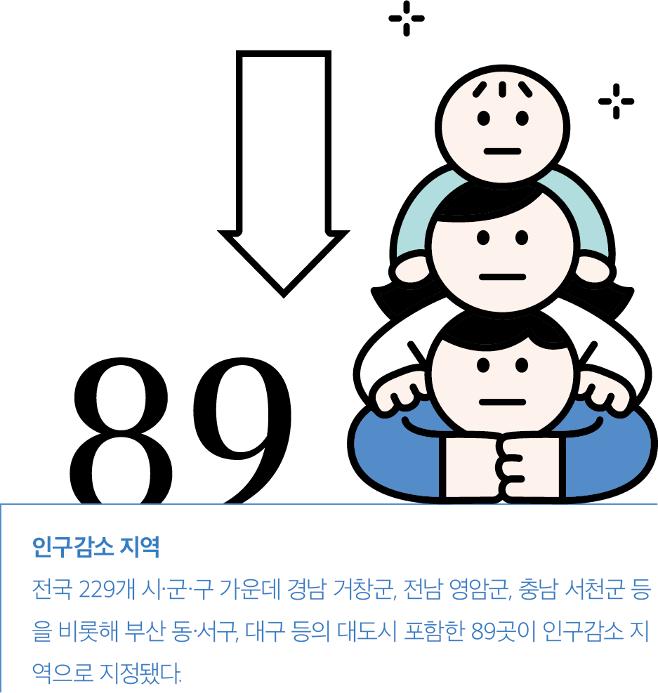 지역의 인구감소, 지방소멸 등은 심심치 않게 뉴스에 등장하는 단어들이다. 인구감소를 억제하기 위한 정부의 많은 노력에도 불구하고, 0명대 합계출산율과 총인구 감소 등 초고령화 시대로의 전환을 막기에는 역부족인 상황이다. 지난해 행정안전부는 전국 229개 시·군·구 가운데 인구감소 지역으로 89곳을 지정했다. 인구감소 지역에는 경남 거창군, 전남 영암군, 충남 서천군 등을 비롯해 부산 동·서구, 대구 등의 대도시도 포함되어 있다. 이와 같은 행정안전부의 발표는 지역공동체의 기능을 무너뜨리고 축소 지역, 쇠퇴 지역을 넘어 소멸 지역이 될 것이라는 우려를 키우고 있다.
