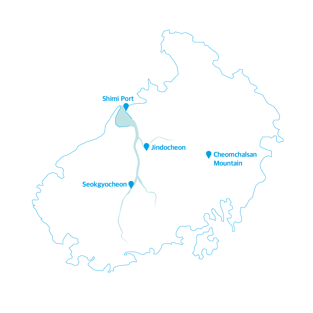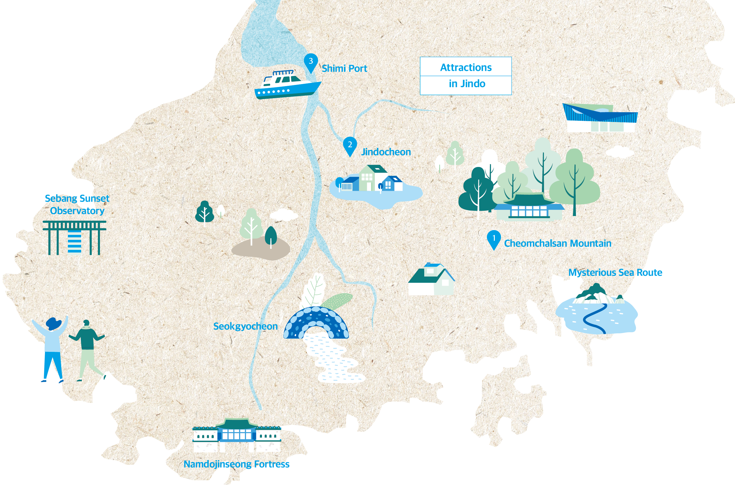 Be it a creek or a river, all waterways have a beginning and an end. Hangang River, which runs through the center of Seoul, originates from Geumryongso, Taebaek and ends in the West Sea. Naeseongcheon Stream winding throughout Bonghwa and Yecheon begins near Sundalsan Mountain—which is part of the Baekdudaegan Mountain Range—and finally joins Nakdonggang River. Jindocheon Stream has its own origin and end. It starts from Suribong Peak(388.5m) of Cheomchalsan Mountain and runs around 10km, almost reaching the sea before finally joining Seokgyocheon Stream in Haechang-ri. Seokgyocheon, the longest stream in Jindo, meets Jindocheon to become a greater waterway and ends in Dadohae. So, walking along Jindocheon Stream, you can learn about the lifecycle of a stream while exploring the mountains and the sea that unfold along the path of Jindocheon Stream.