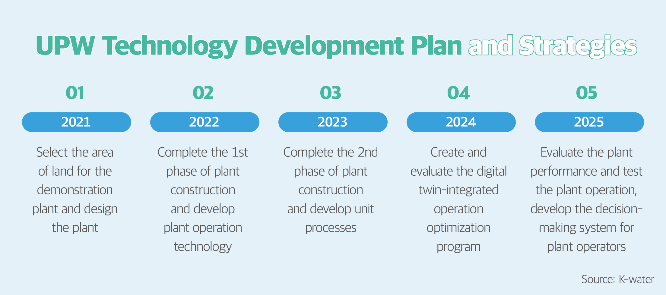Given the high initial cost and entry barrier, the public and private sectors are working together for UPW technology development under government support. K-water, Korea’s No. 1 water management organization, is also participating in the project. In recognition of its proven track record, K-water was selected as the final research institute for the project to develop the integrated technology for the “design, construction, and operation of high-purity industrial water plants” in June 2021. Subsequently, K-water and Korea Environmental Industry and Technology Institute built a high-purity industrial water (UPW) demonstration plant within SK Siltron in Gumi, Gyeongbuk Province and successfully completed the 1st phase of the construction project in May 2023.
