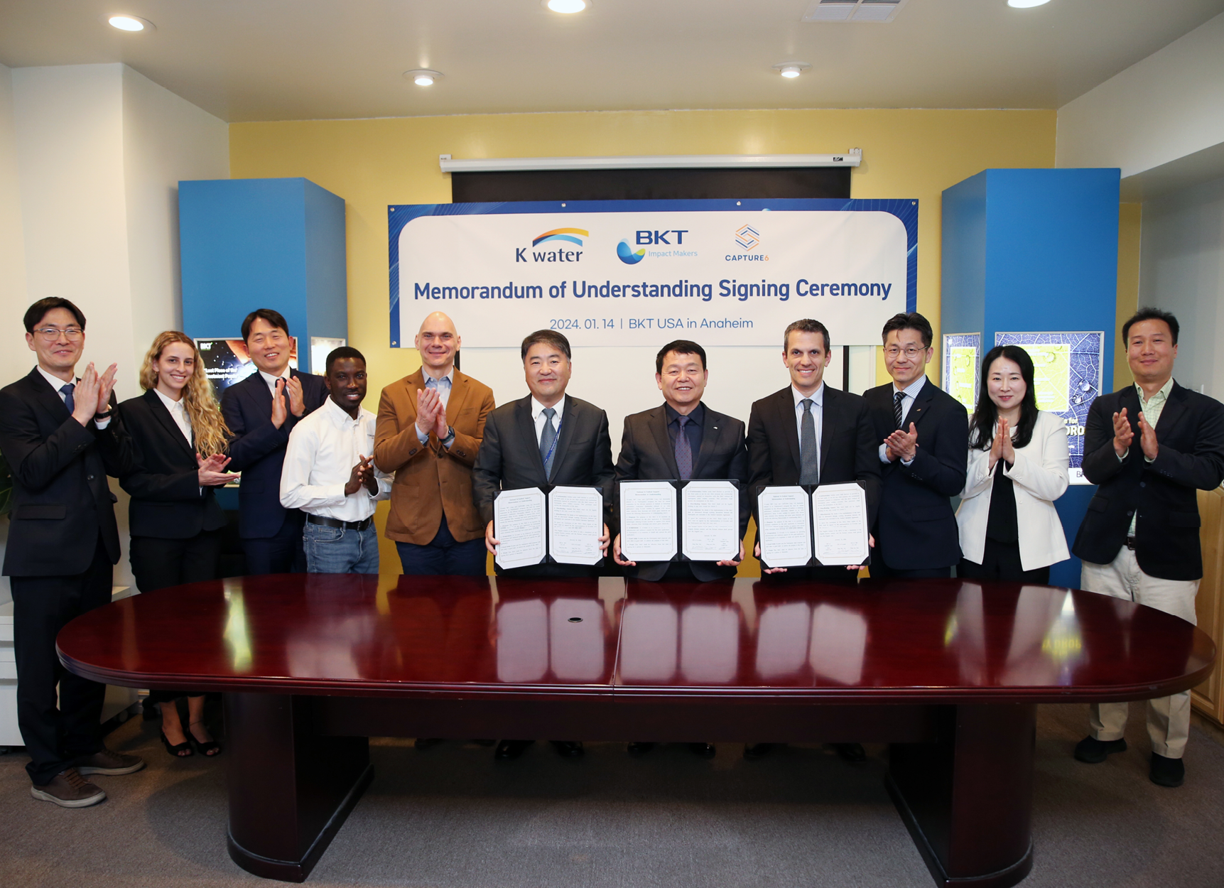 K-water signed a testbed agreement with private companies operating in Korea and other countries including Tomorrow Water (Capture 6) on January 14 in Los Angeles, USA to support the development of innovative water technologies. Under the agreement, K-water will provide the pilot plant for the Daesan seaside seawater desalination facility as a testbed that is currently under construction to supply industrial water to manufacturers in the northwestern region of Chungnam Province, which has been experiencing chronic water shortages. The testbed will be used to help test and demonstrate the technology to reprocess high-saline wastewater discharged after seawater desalination and wastewater discharged from seawater desalination using carbon dioxide from the air.