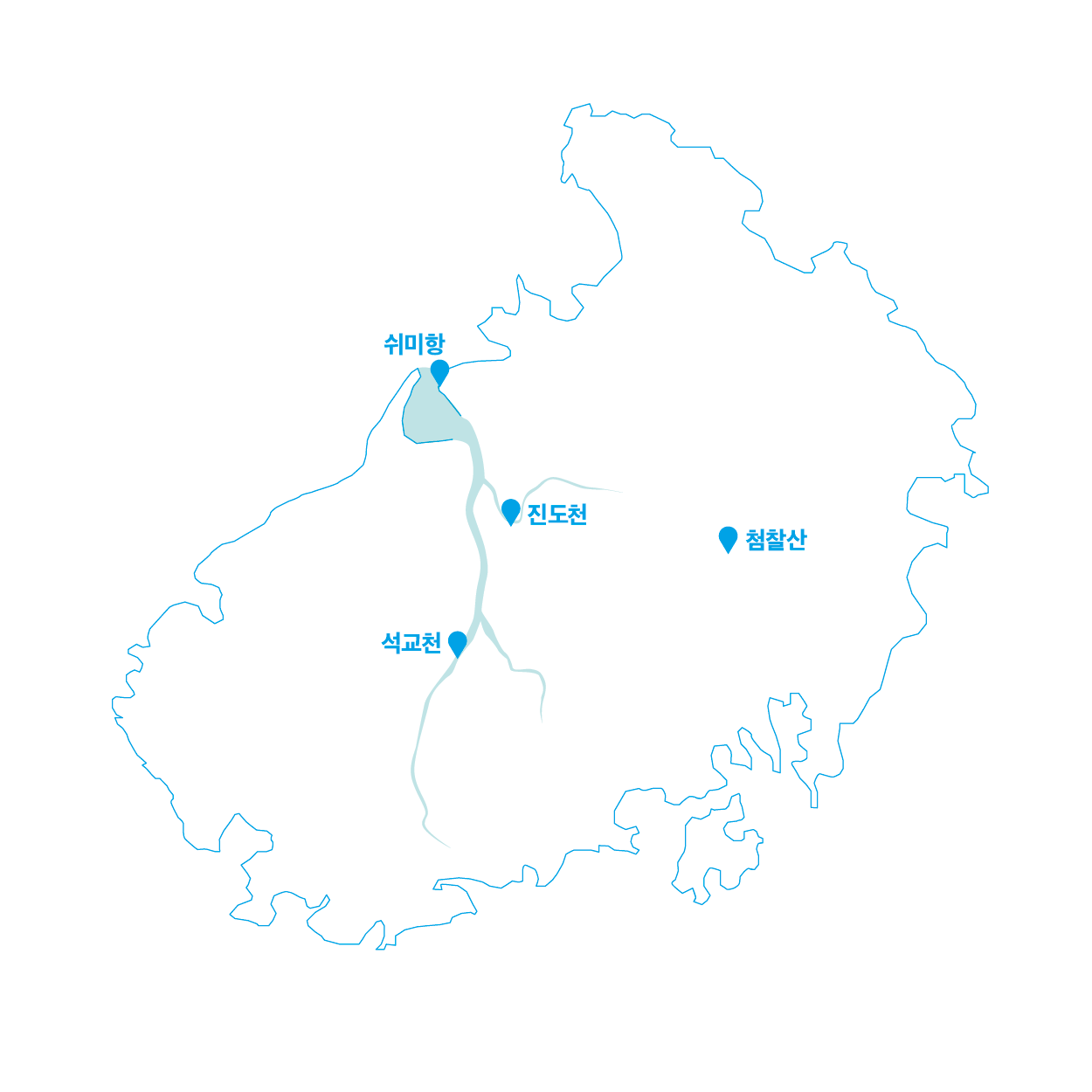 개천이건 강이건 모든 물길에는 시작과 끝이 있다. 서울의 중심부를 흐르는 한강은 태백의 검룡소에서 발원해 서해에 합수하며 끝나고, 봉화와 예천을 굽이굽이 흐르는 내성천은 백두대간의 선달산 부근에서 발원해 낙동 강에 합수한다. 진도천도 마찬가지다. 첨찰산의 지맥인 수리봉(388.5m)에서 발원해 바다 코앞까지 10여km를 흐르다가 해창리 일대에서 석교천에 합수하며 진도 천이란 이름 앞에 놓인다. 진도에서 가장 긴 하천인 석교천은 진도천을 품으며 더 큰 물길이 되고, 제법 큰 물 길인 채로 다도해에 합수한다. 그렇기에 진도천을 걷는 다는 건 개천의 한살이를 지켜본다는 뜻이고, 진도천을 따라 산과 바다를 이어 걷는다는 의미이기도 하다.
