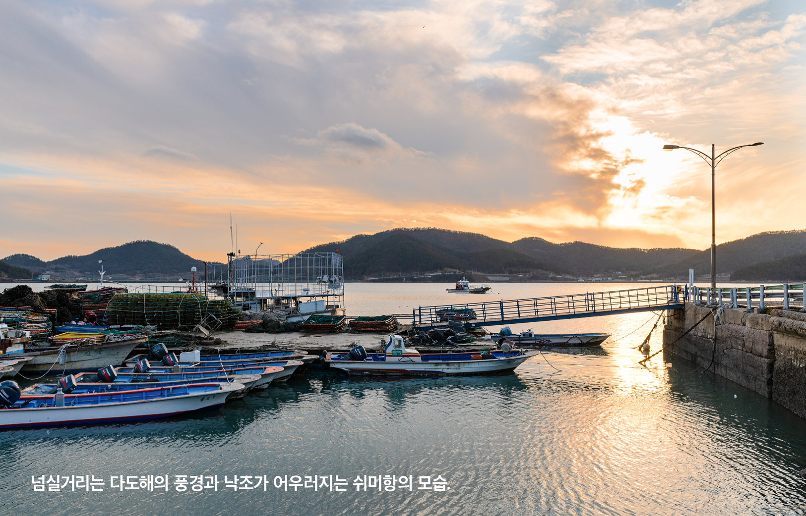 수천 년 전 벌어졌을 일들에 대한 감상을 잠시 뒤로 하고, 길은 해창들에서부터 진도천이 석교천과 합수하는 대신산업 앞을 지나 소포방조제까지 내처 3km가량을 물길 따라 이어진다. 소포방조제는 소포만 간척을 위해 조성한 것으로 바다는 그 끝에 있다. 드넓은 농토 대신 십 척의 배가 반기는 쉬미항 그리고 석교천이 바다가 되는 자리다. 마침 해 질 녘이라면 쉬미항 어귀에서 낙조도 감상할 만하다. 다도해의 저도, 소저도, 작도도 같은 섬이 붉게 물들며 징검다리처럼 이어진다. 천에서 시작해 바다에 이르기까지, 내(川)의 한 생을 거닌 하루가 낙조와 함께 물든다.
