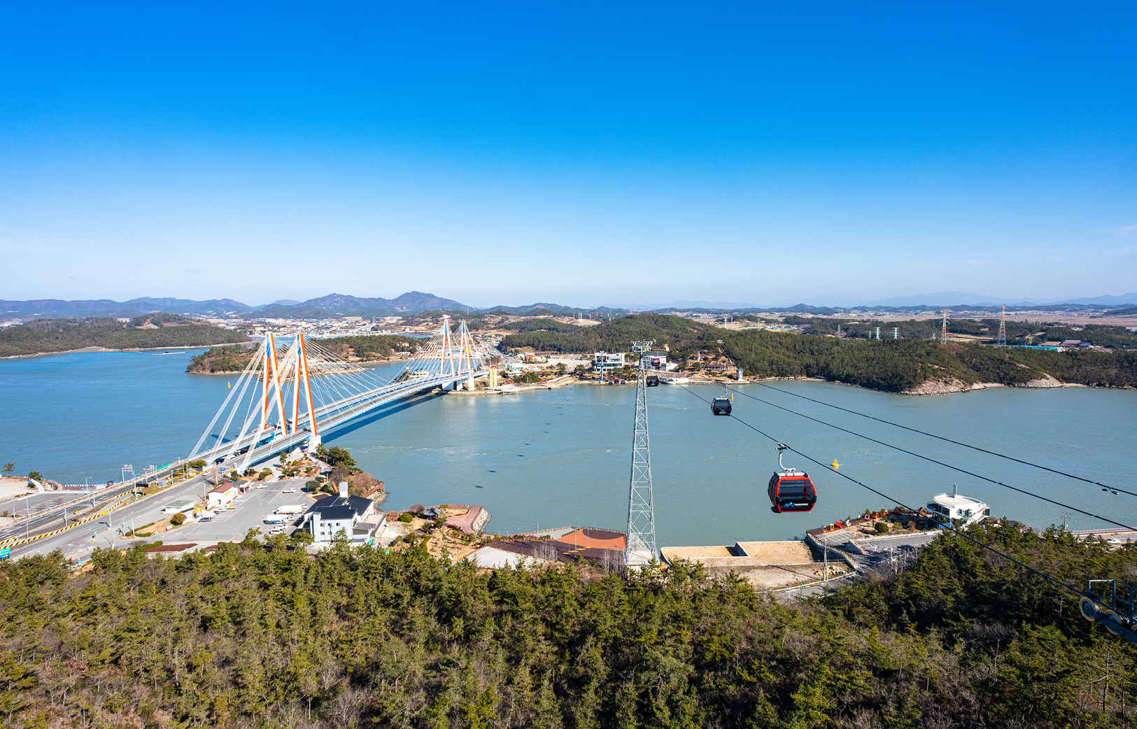 진도타워에서 바라본 울돌목과 울돌목을 가로질러 오가는 케이블카.