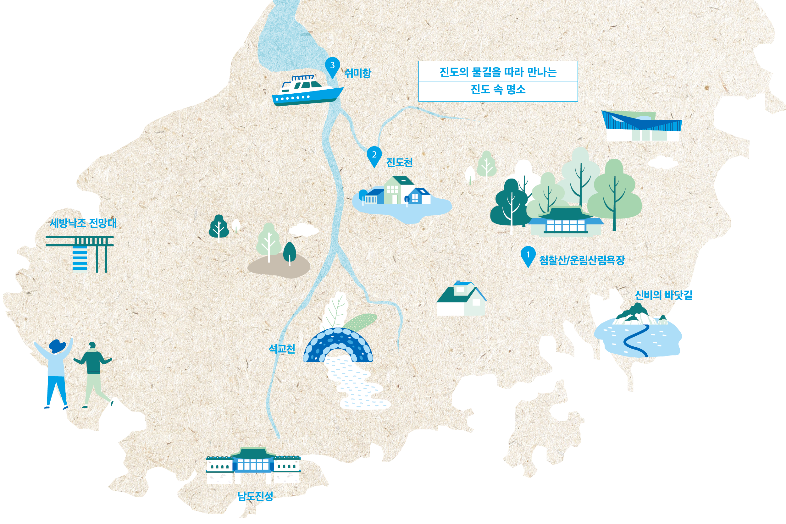 시내인가 했더니 어느 순간 개천이고, 이내 강만큼 폭을 넓히더니 불과 10여km 끝에서 바다를 만난다. 진도천은 곧이어 바다가 될 때까지, 진도 소읍과 간척지를 지나며 시나브로 몸집을 불린다. 때로는 일상의 평범한 풍경처럼 흐르고, 일정 구간에서는 간척지 특유의 무늬를 품은 수로처럼 흐른다. 아늑한 산세에서 시작해 작은 물길을 따라 포근한 남도의 바다에 닿기까지, 두 발로 만난 진도의 풍경 속으로.