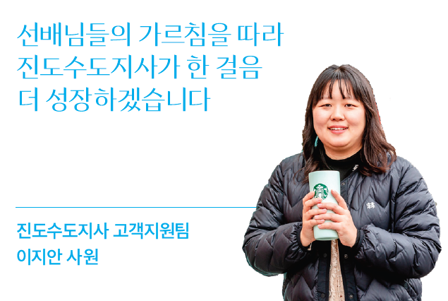 진도수도지사는 오랫동안 일을 해온 선배님들이 많이 계십니다. 그만큼 노하우가 풍부하고, 어려운 점이 있을 때 잘 도와주시곤 해요. 특히 곧 퇴직을 앞두고 계신 한선옥 대리님은 처음 지사가 생겼을 때부터 업무 매뉴얼을 만들며 기반을 다졌던 분인데, 제가 많이 배우고 의지해왔던 선배님입니다. 이처럼 회사에 믿고 의지할 수 있는 선배님들이 함께한다는 사실이 자랑스럽습니다. 선배님들이 탄탄하게 다져놓은 기반을 따라 저희도 후배들에게 도움을 줄 수 있도록 최선을 다하겠습니다. 매년 한파가 올 때마다 고생이 참 많았는데요. 고생한 직원분들과 함께 맛있는 간식과 커피를 나눌 수 있는 시간을 마련해주셔서 감사합니다!