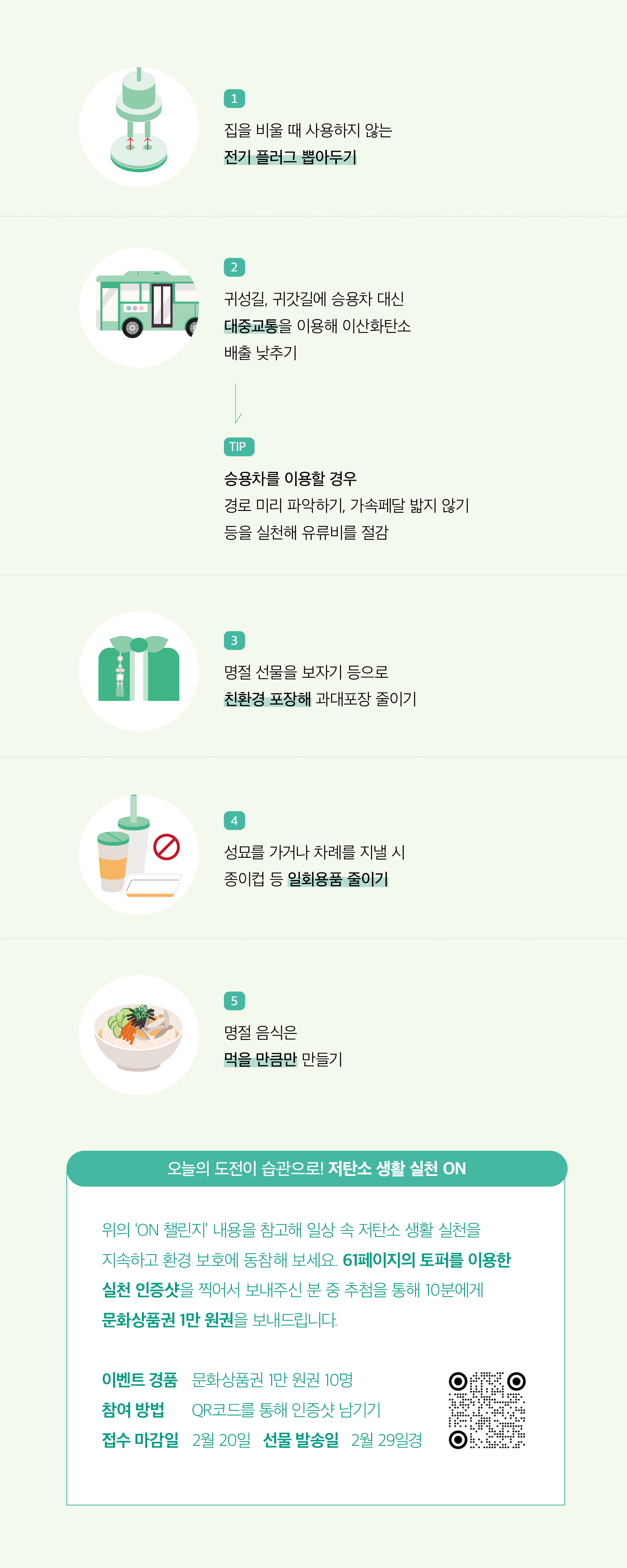 민족 최대의 명절 설날, 보다 뜻깊은 설 명절을 보내기 위해 알아두면 좋은 저탄소 생활실천법을 소개합니다. 명절뿐만 아니라 이후로도 꾸준히 저탄소 생활 실천을 이어 나가 보세요!