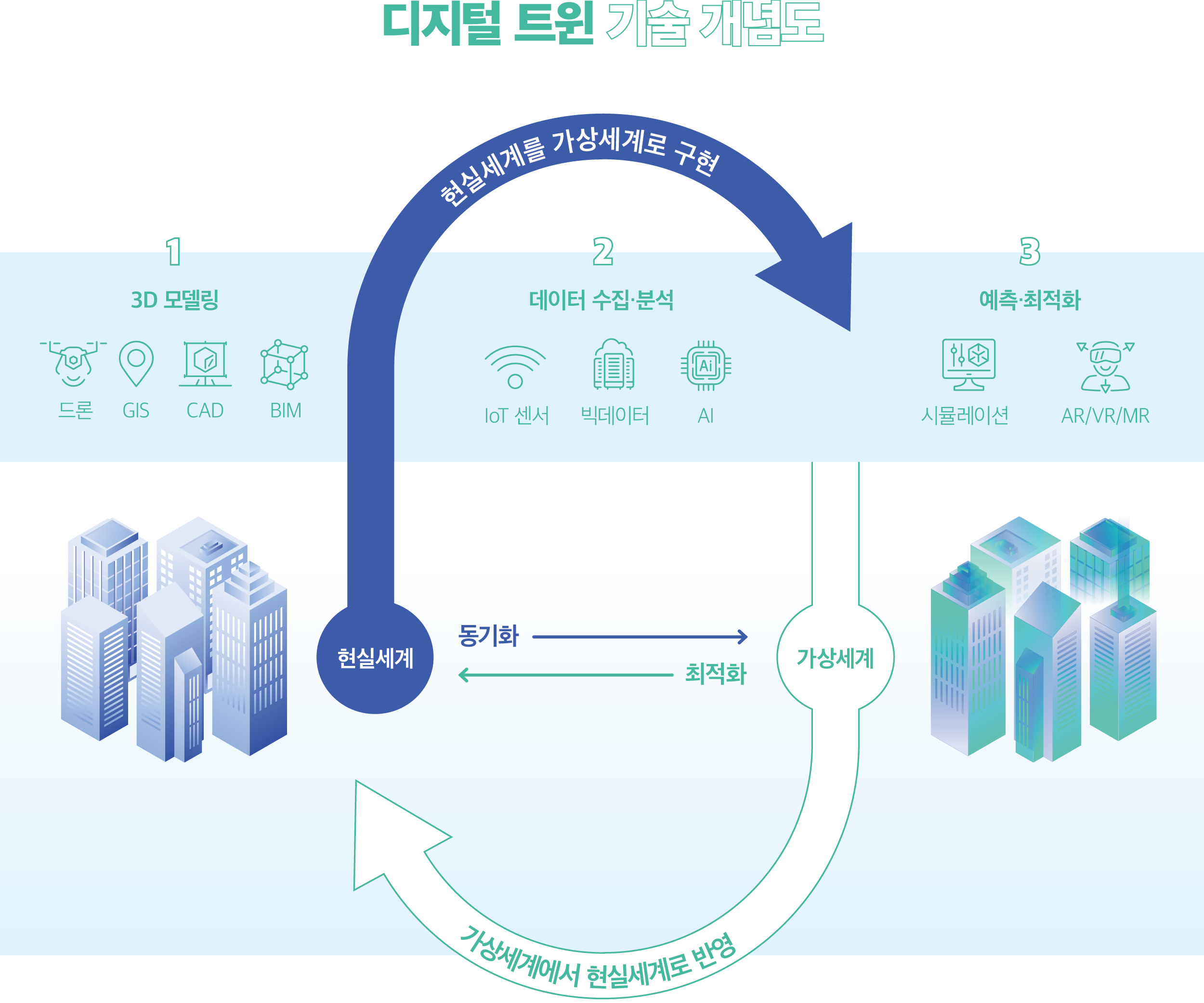 디지털 트윈 기술은 기후위기 극복을 위한 새로운 기술 가운데 핵심 KEY로 떠오르고 있다. 디지털 트윈은 온라인 가상공간에 디지털 복제본을 만들고 시뮬레이션, 러신머닝, 추론 등을 통해 최적의 의사결정을 돕는다. 다시 말해, 가상공간에 현실과 똑같은 쌍둥이를 만들고, 현실에서 발생할 수 있는 상황들을 모의실험할 수 있는 기술이다. 시간, 공간, 안전, 비용 등의 제약으로 현실적으로 하기 어렵거나 할 수 없는 실험을 가상으로 해볼 수 있다는 점에서 활용도가 매우 높은 기술이다.