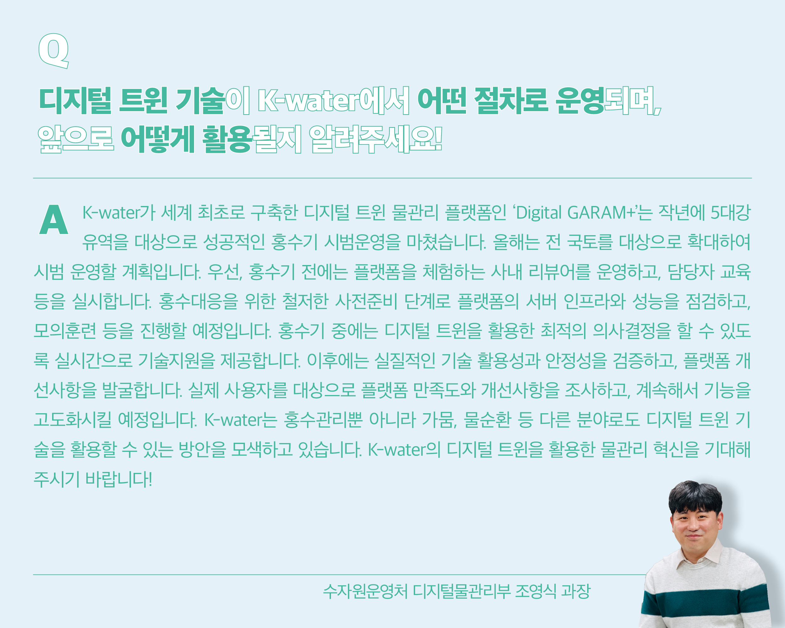 K-water 또한 기후위기에 따른 물관리의 불확실성에 대응하기 위해 혁신적인 물관리 디지털 전환을 선포했다. 디지털 트윈 기술을 활용한 Digital GARAM+, 스마트 댐 안전관리, AI 정수장 등을 운영 중인 것.