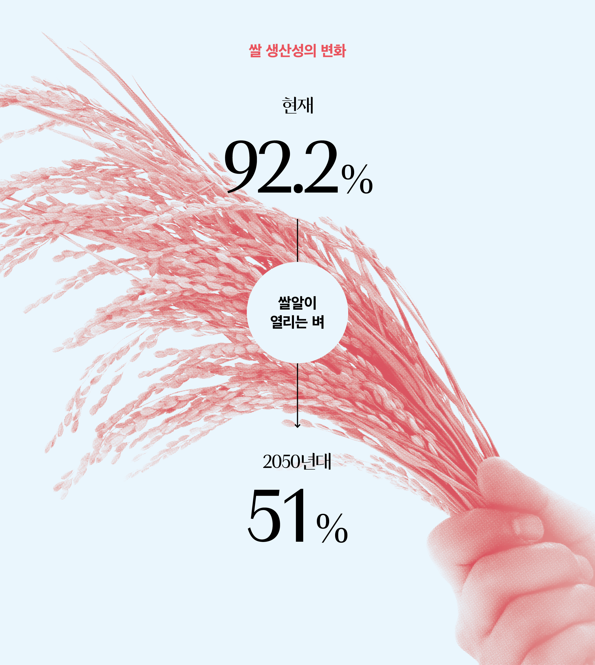 하지만 기후변화로 이 생산성은 2060년대 368kg/10a로 줄어들 것이라는 게 국립식량과학원의 전망입니다. 쌀 걱정을 하던 1970년대보다도 생산성이 떨어지는 겁니다. 1970년대보다 농지 면적 자체도 적다 보니, 전체 생산량은 1970년대보다도 훨씬 줄어들 수밖에 없고요.