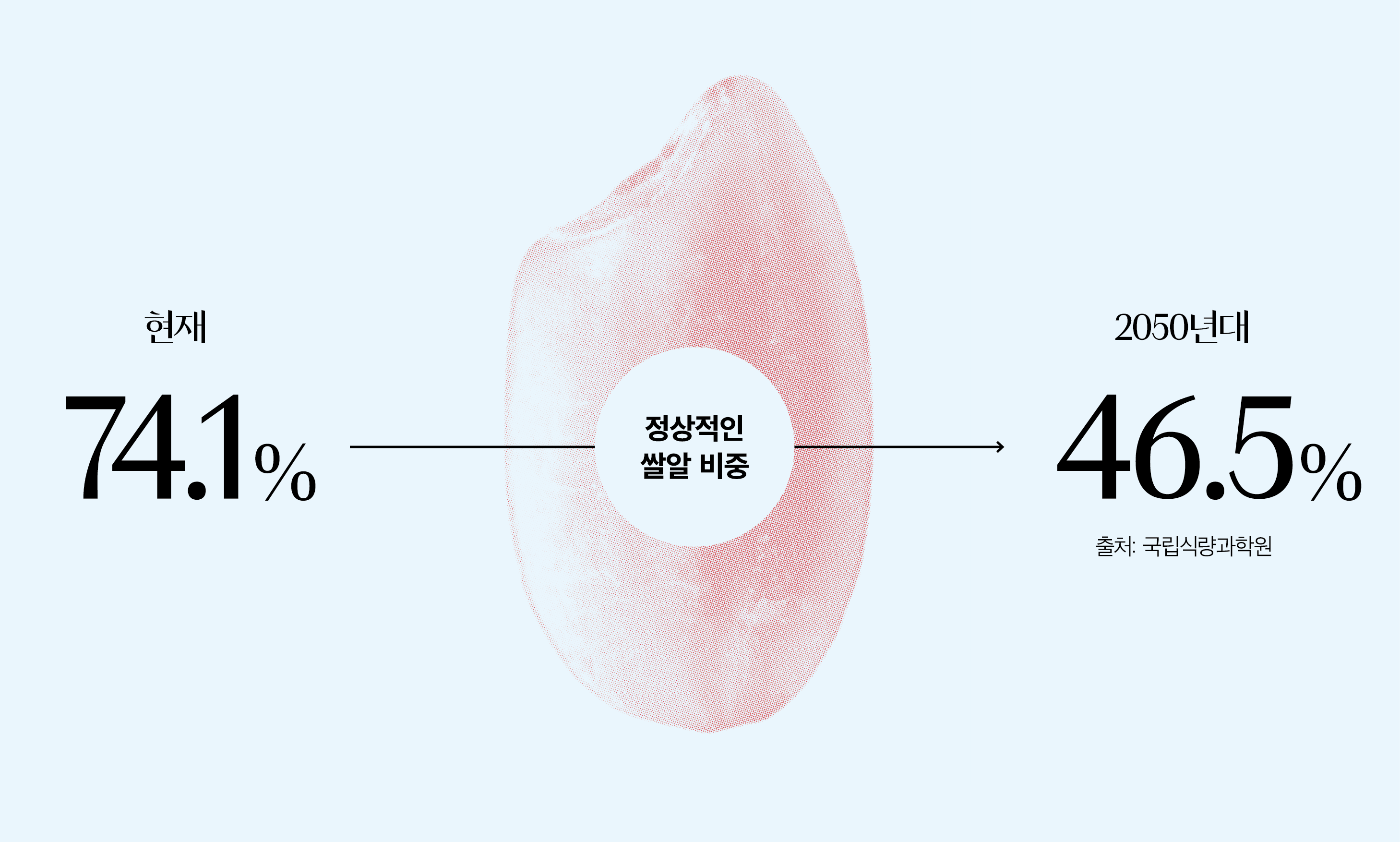 ‘아니, 남는 쌀이 많아서 양곡법을 두고 한바탕 논란이 일었는데, 무슨 쌀 수급 위기냐’ 싶은 분들도 있을 겁니다. 그러나 불과 10년 후면 이런 양곡법 논란을 ‘배부른 소리 하던 시절’로 기억할지도 모릅니다. 현재 논에 심은 벼 가운데 쌀알이 열리는 벼는 92.2% 정도입니다. 그렇게 열린 쌀알 가운데 ‘정상립’이라고 불리는 상품성 있는 쌀알의 비중은 74.1%고요. 그런데 우리가 온실가스 감축에 나서지 않고 지금처럼 계속 살아간다면(RCP 8.5 시나리오), 2050년 쌀알이 열리는 벼는 51%로 줄고, 그렇게 열린 쌀알 가운데 정상립의 비중은 46.5%로 떨어질 것으로 전망됩니다. 말라 죽거나, 타 죽거나, 기존보다 지나치게 빠른 속도로 쌀알이 과숙성하면서 쌀의 생산성이 급격히 떨어지는 것입니다.